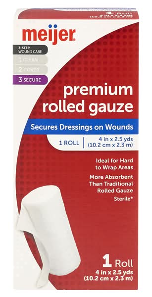 Meijer Premium Rolled Gauze is designed for superior performance in hard to wrap areas and is more absorbent compared to traditional rolled gauze.