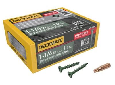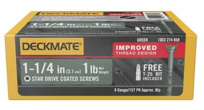 Make the most of your of your outdoor project with DECKMATE brand exterior screws. Designed for use with all treated lumber and all exterior projects to connect wood to wood. A lifetime polymer coating provides extra corrosion resistance that is guaranteed for the life of your outdoor project. WARNING: Cancer and Reproductive Harm www.P65Warnings.ca.gov • Color: Green • Size: 1 1/4 in