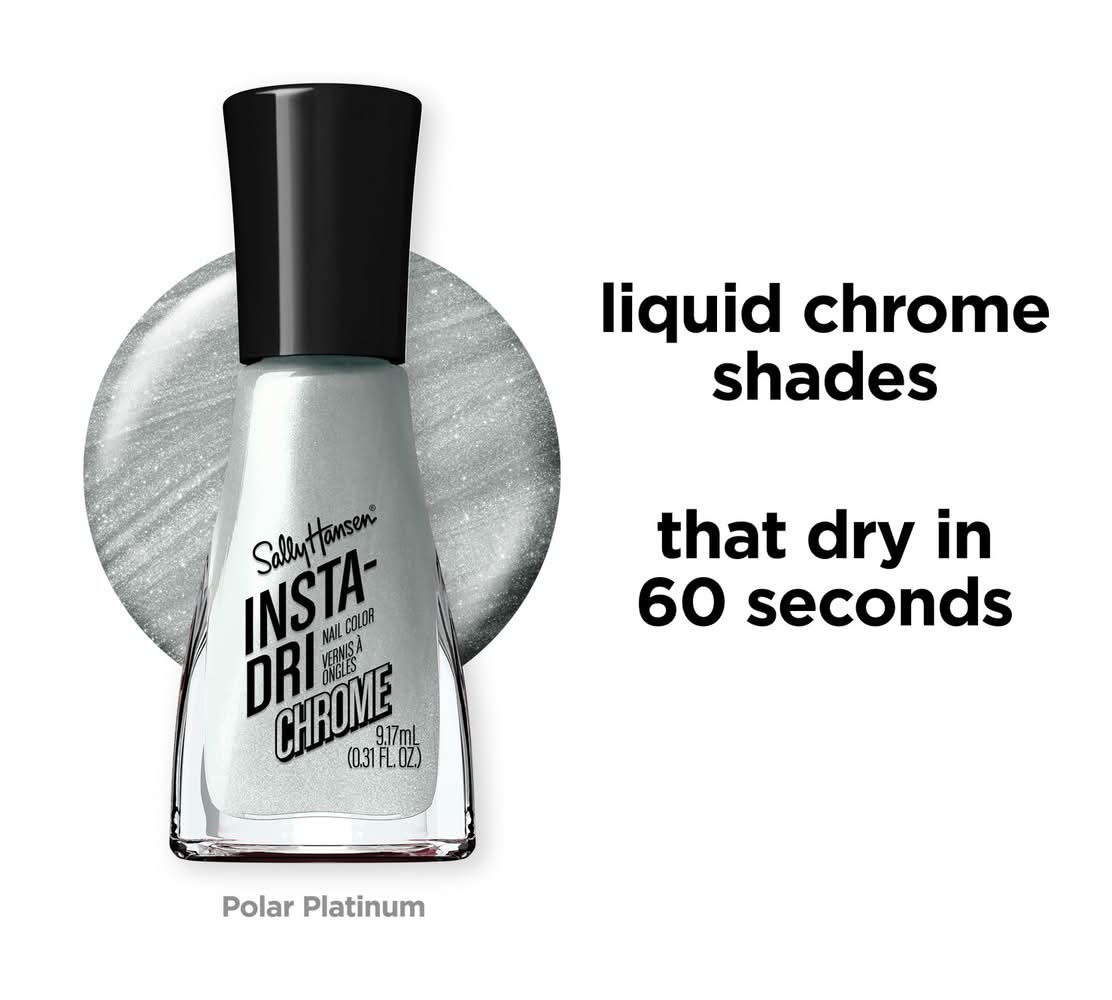 4 NEW! Sally Hansen Insta-Dri chrome collection. Metallic hues to create fire chrome looks! Dries in 60 seconds. One coat. One stroke. Done. No wait. No smudges. • Color: Polar platinum 125 • Packaging: Reusable