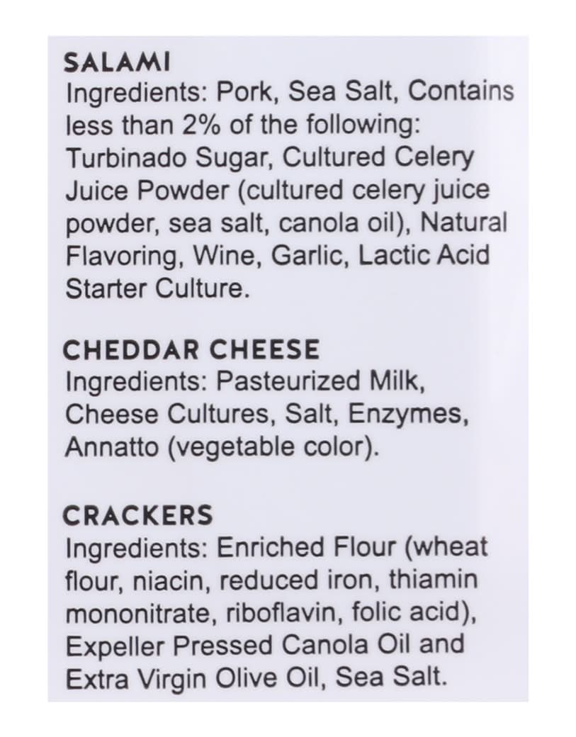 Ingredients: Salami Ingredients: Pork, Sea Salt, Contains Less than 2% of the Following: Turbinado Sugar, Cultured Celery Juice Powder Cultured Celery Juice Powder, Sea Salt, Canola Oil, Natural Flavoring, Wine, Garlic, Lactic Acid Starter Culture. Cheddar Cheese Ingredients: Pasteurized Milk, Cheese Cultures, Salt, Enzymes, Annatto Vegetable Color. Crackers Ingredients: Enriched Flour Wheat Flour, Niacin, Reduced Iron, Thiamin Mononitrate, Riboflavin, Folic Acid, Expeller Pressed Canola Oil and Extra Virgin Olive Oil, Sea Salt. Contains: Milk, Wheat