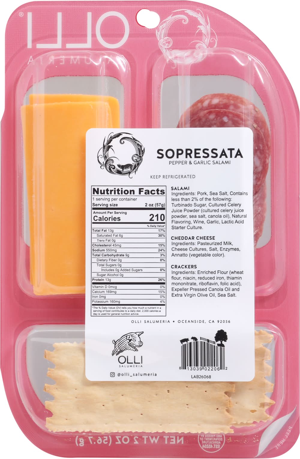 Sopressata flavorful salami paired with Mild Cheddar and La Panzanella Artisanal Crackers • Pack size: 10 • Olli Salumeria, Oceanside, CA, 92056