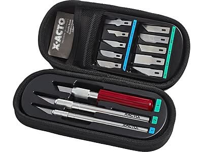 Cut precise shapes with this X-ACTO Compression Basic Knife Set. Rely on this knife set to cut through a wide range of materials. The set includes three knives with aluminum handles for easy maneuvering and an assortment of 13 interchangeable, carbon steel blades for making accurate cuts. This X-ACTO Compression Basic Knife Set comes in a compact nylon case for organizing, storing and carrying and includes a reference guide with instructions for managing handles and blades. - Basic knife set for making carefully crafted cuts - Assorted-color set in black nylon compression case - Set includes three knives and 13 blades