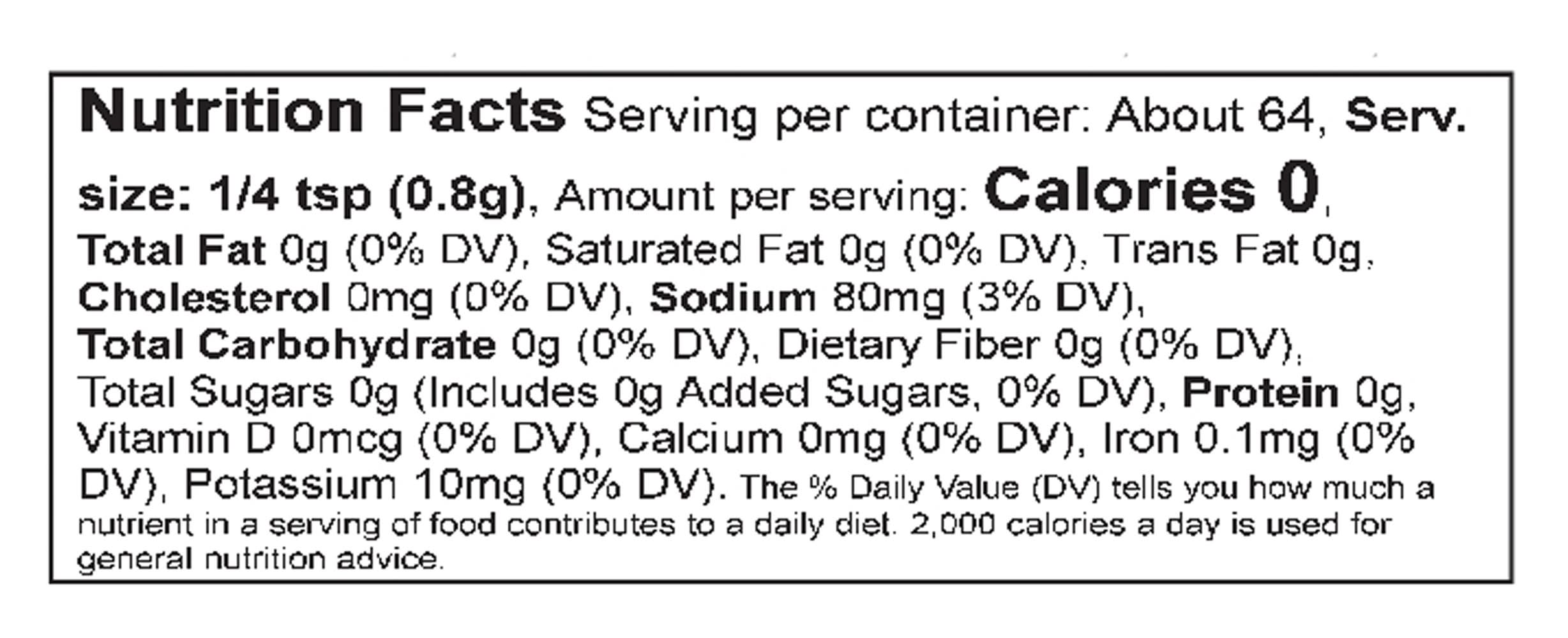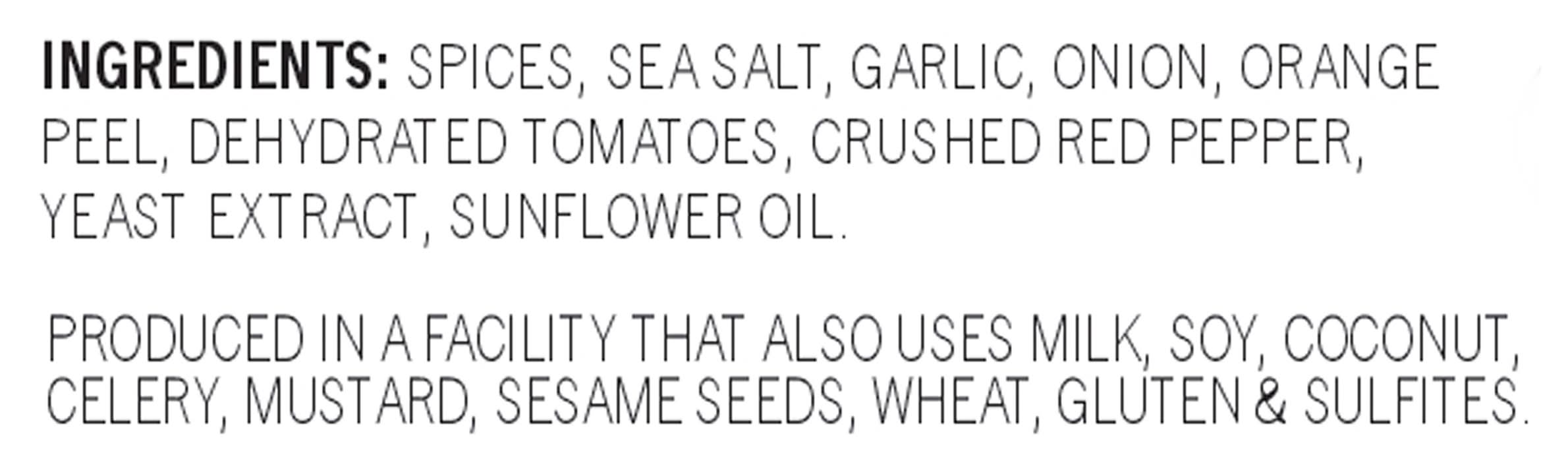 Ingredients: Spices, Sea Salt, Garlic, Onion, Orange Peel, Dehydrated Tomatoes, Crushed Red Pepper, Yeast Extract, Sunflower Oil Contains: Milk, Soybeans, Tree Nuts, Coconuts, Celery, Mustard, Sesame, Wheat, Gluten, Sulfites