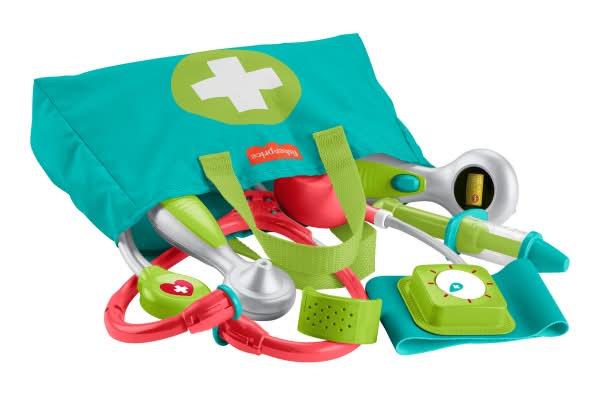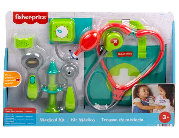 With the Fisher-Price Medical Kit, preschool kids can “treat” and “care for” patients with endless doctor role-play! This playset features 7 medical-themed play pieces for mini-MDs to use, including a stethoscope to “listen” to their patient's heart, a thermometer to “check” their temperature, an otoscope to take a peek inside their ears, and a blood pressure cuff with a spinning gauge. Even getting a shot becomes fun with the toy syringe and a bandage cuff for pretend ouches. Colors and decorations may vary. Pretend doctor playset with 7 medical tool play pieces, including a stethoscope, blood pressure cuff, thermometer, otoscope, syringe, bandage, and fabric “doctor” bag. Press button on thermometer to go from “sick” to “well” Pump the blood pressure cuff to see the gauge spin All play pieces store inside the bag, so making “house calls” is a breeze Encourages imaginative pretend play and healthy habits for preschool kids ages 3 years and older