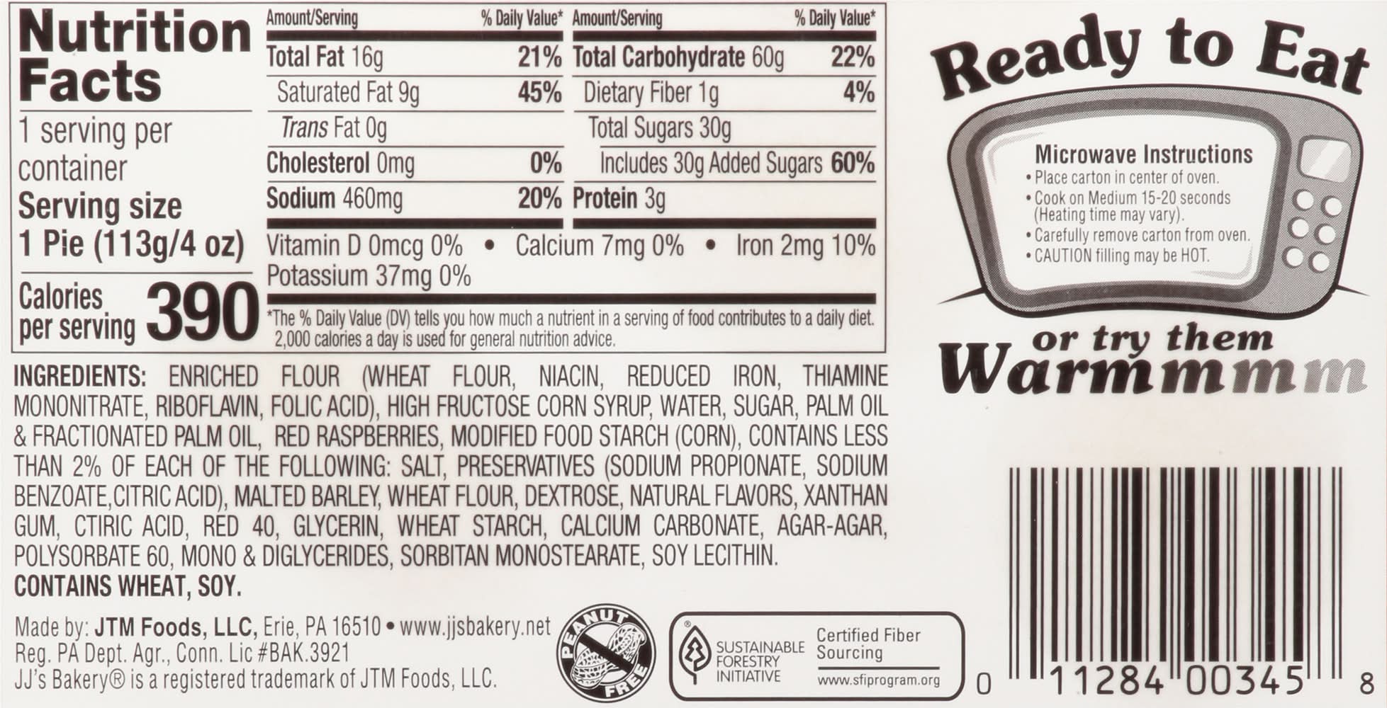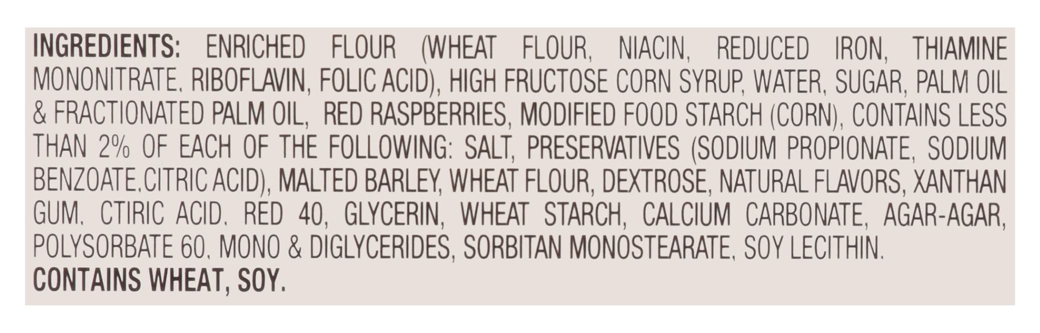 Ingredients: Enriched Flour (Wheat Flour, Niacin, Reduced Iron, Thiamine Mononitrate, Riboflavin, Folic Acid), High Fructose Corn Syrup, Water, Sugar, Palm Oil & Fractionated Palm Oil, Red Raspberries, Modified Food Starch (Corn), Contains Less than 2% of Each of the Following: Salt, Preservatives (Sodium Propionate, Sodium Benzoate, Citric Acid), Malted Barley, Wheat Flour, Dextrose, Natural Flavors, Xanthan Gum, Citric Acid, Red 40, Glycerin, Wheat Starch, Calcium Carbonate, Agar-Agar, Polysorbate 60, Mono & Diglycerides, Sorbitan Monostearate, Soy Lecithin Contains: Wheat, Soybeans