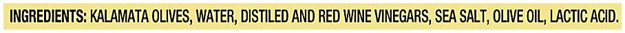 Ingredients: Kalamata Olives, Water, Distilled and Red Wine Vinegars, Sea Salt, Olive Oil, Lactic Acid