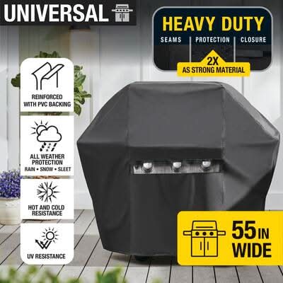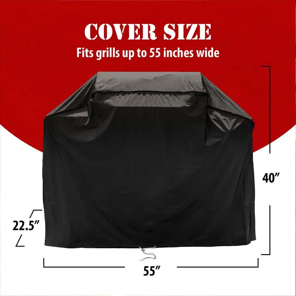Protect your grilling investment with the Universal 55 in. Premium Grill Cover. The heavy-duty polyester coating provides maximum weather protection. Weather resistant coating provides an attractive grill cover for your patio. For use with Nexgrill®, Weber®, Char-Broil®, Napoleon®, Monument®, Master Fo This product can expose you to chemicals including Dehp, which is known to the state of California to cause birth defects or other reproductive harm. For more information, go to: www.P65Warnings.ca.gov. • Color: Black • Size: 55 In