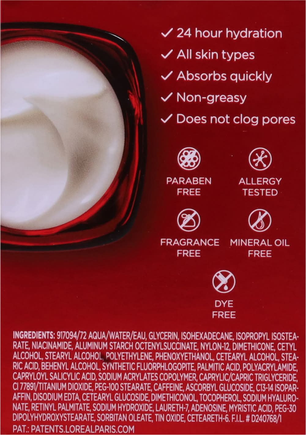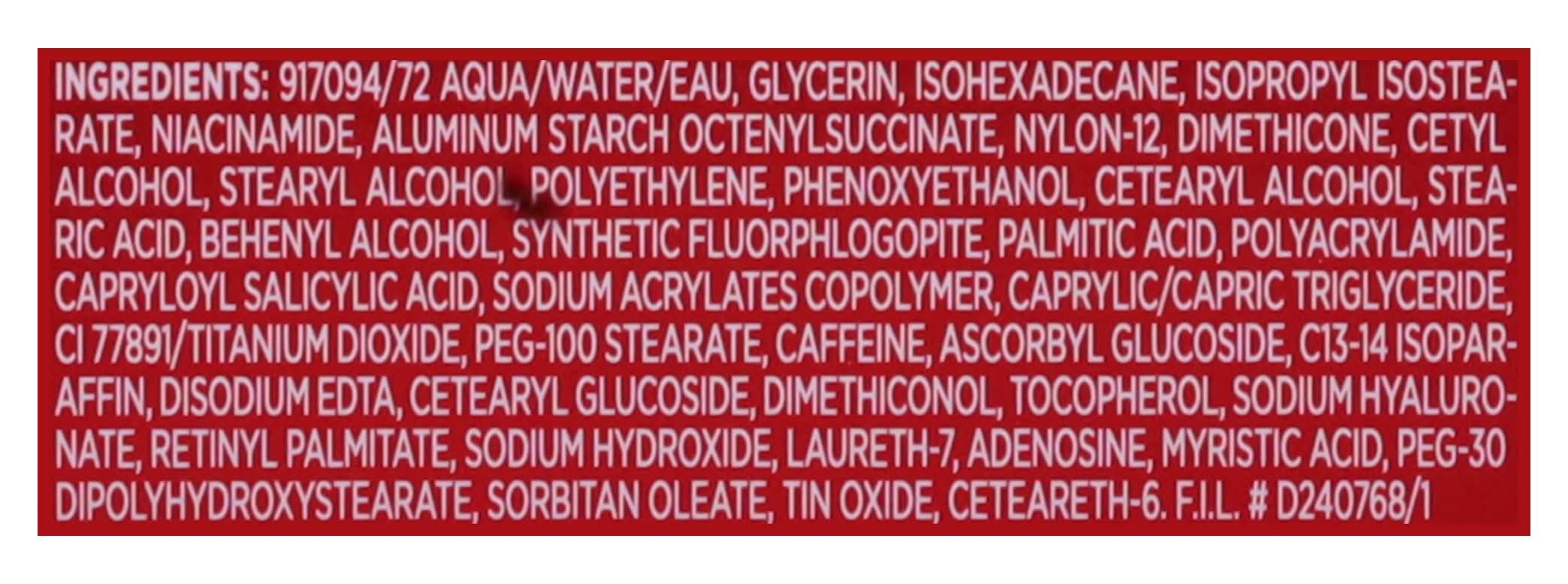 Ingredients: 917094/72 Aqua/Water/Eau, Glycerin, Isohexadecane, Isopropyl Isostearate, Niacinamide, Aluminum Starch Octenylsuccinate, Nylon-12, Dimethicone, Cetyl Alcohol, Stearyl Alcohol, Polyethylene, Phenoxyethanol, Cetearyl Alcohol, STEA-Ric Acid, Behenyl Alcohol, Synthetic Fluorphlogopite, Palmitic Acid, Polyacrylamide, Capryloyl Salicylic Acid, Sodium Acrylates Copolymer, Caprylic/Capric Triglyceride, CI 77891/Titanium Dioxide, PEG-100 Stearate, Caffeine, Ascorbyl Glucoside, C13-14 Isopar-Affin, Disodium EDTA, Cetearyl Glucoside, Dimethiconol, Tocopherol, Sodium Hyaluro-Nate, Retinyl Palmitate, Sodium Hydroxide, Laureth-7, Adenosine, Myristic Acid, PEG-30 Dipolyhydroxystearate, Sorbitan Oleate, Tin Oxide, Ceteareth-6. F.I.L. # D240768/1