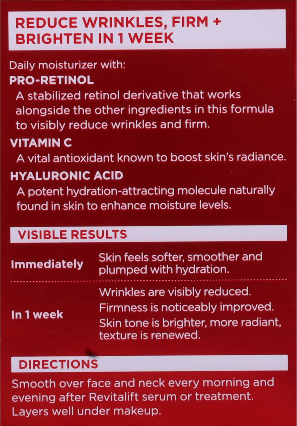 Directions: smooth over face and neck every morning and evening after revitalift serum or treatment. layers well under makeup.