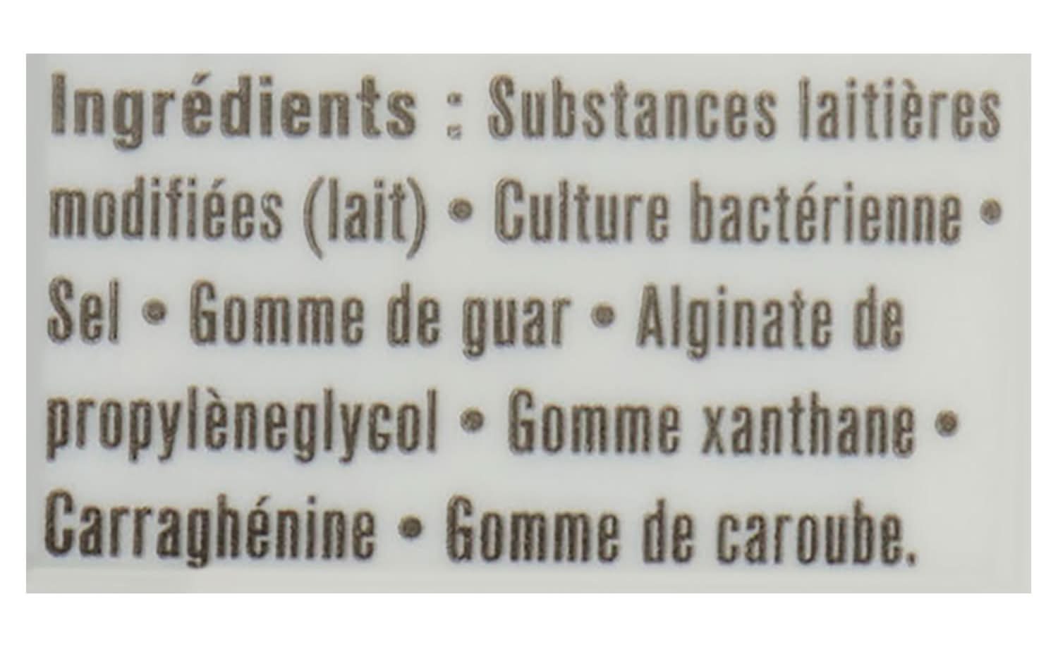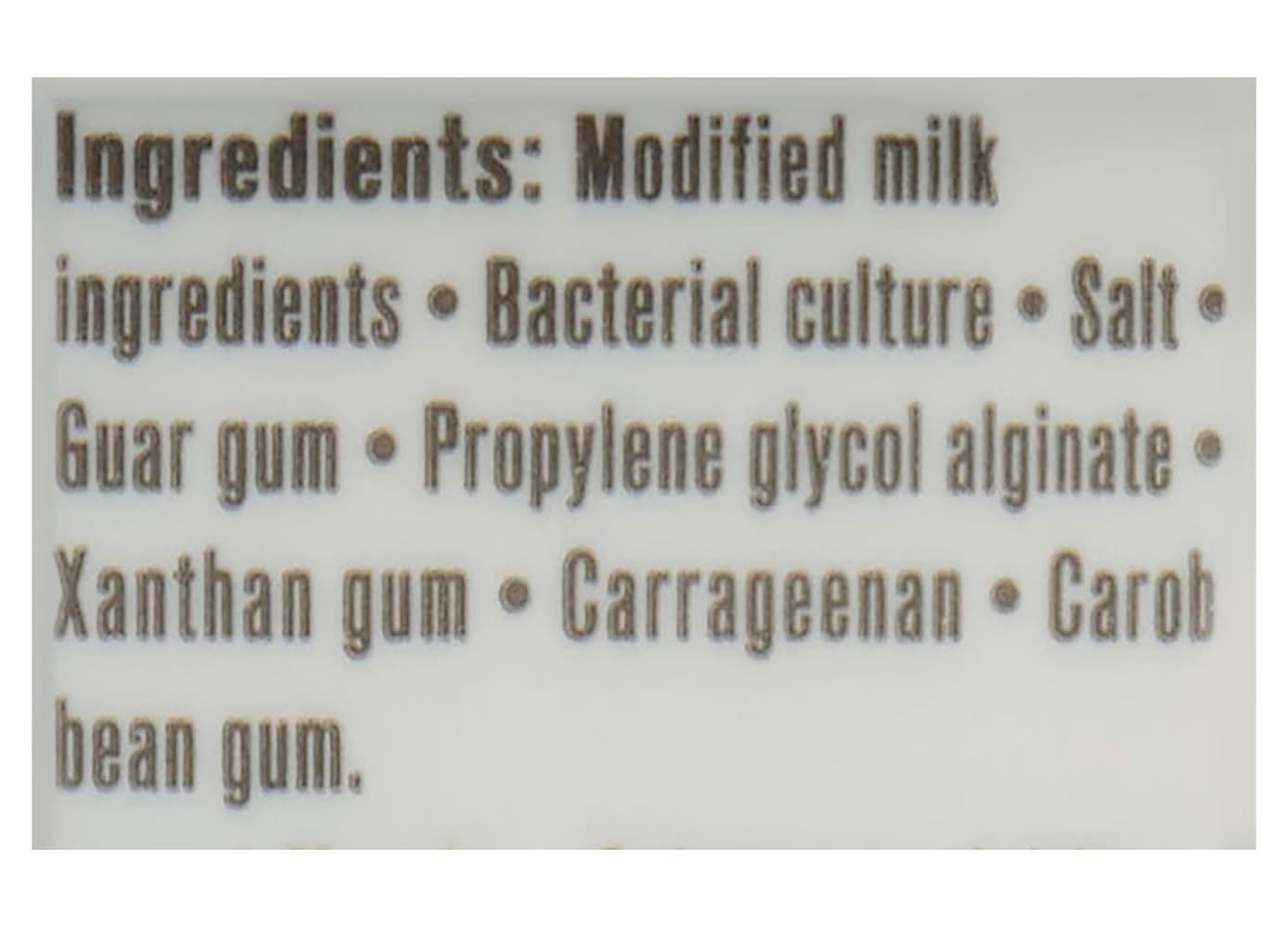 Modified milk ingredients, bacterial culture, salt, guar gum, propylene glycol alginate, xanthan gum, carrageenan, carob bean gum.