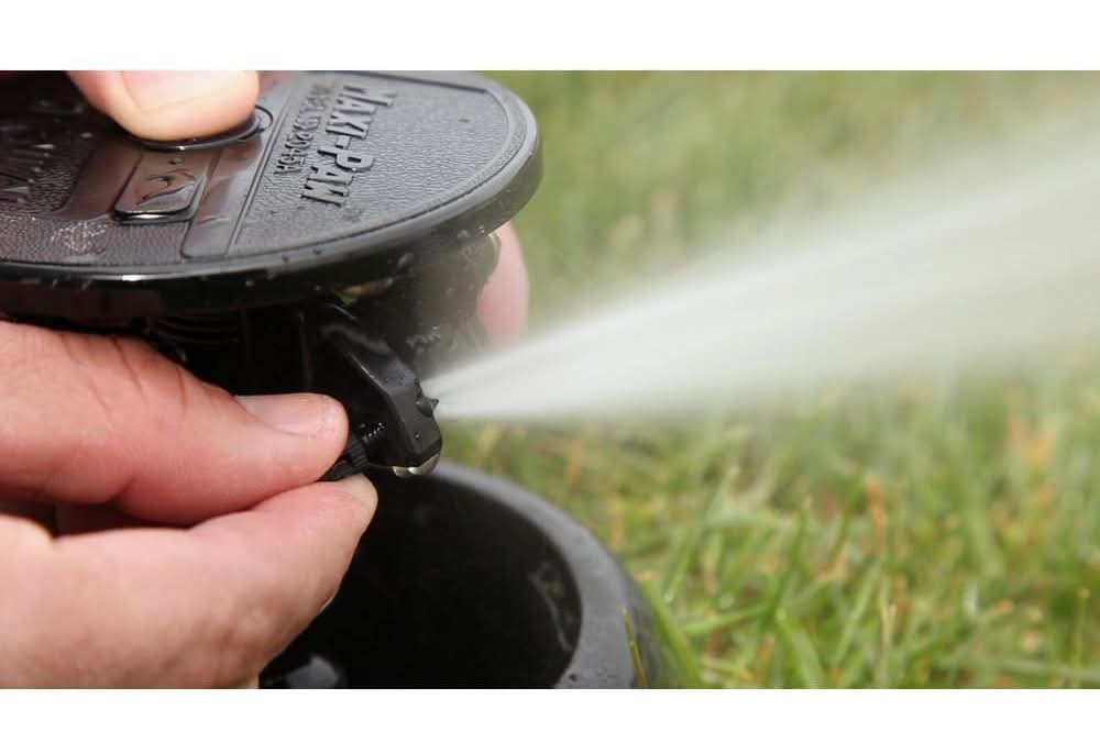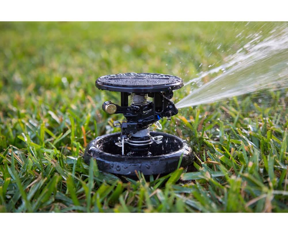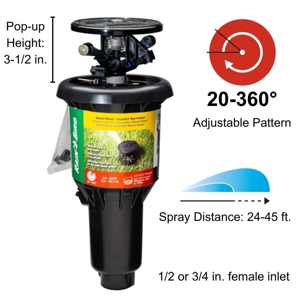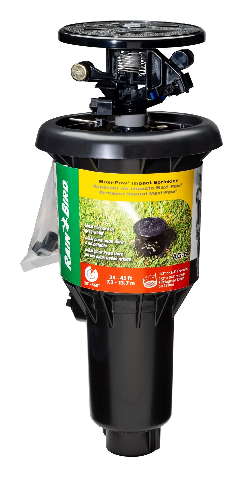 Heavy duty Rain Bird pop-up impact sprinkler. Easy to adjust and comes with 5 extra nozzles to customize watering rate. Excellent choice for reclaimed water irrigation systems. Simple, straight-through flow design for superior performance in dirty water. Double-weighted arm provides a slow rotation speed for optimal throw distance. Diffuser screw breaks water into smaller droplets for uniform watering. Spray distance adjustable from 24-ft to 45-ft spray arc adjustable from 20 to 360 degrees. Full circle (360°) or part circle (20° to 340°) coverage with infinite pattern adjustment. Grit-proof bearing for reliable operation. Color: Black