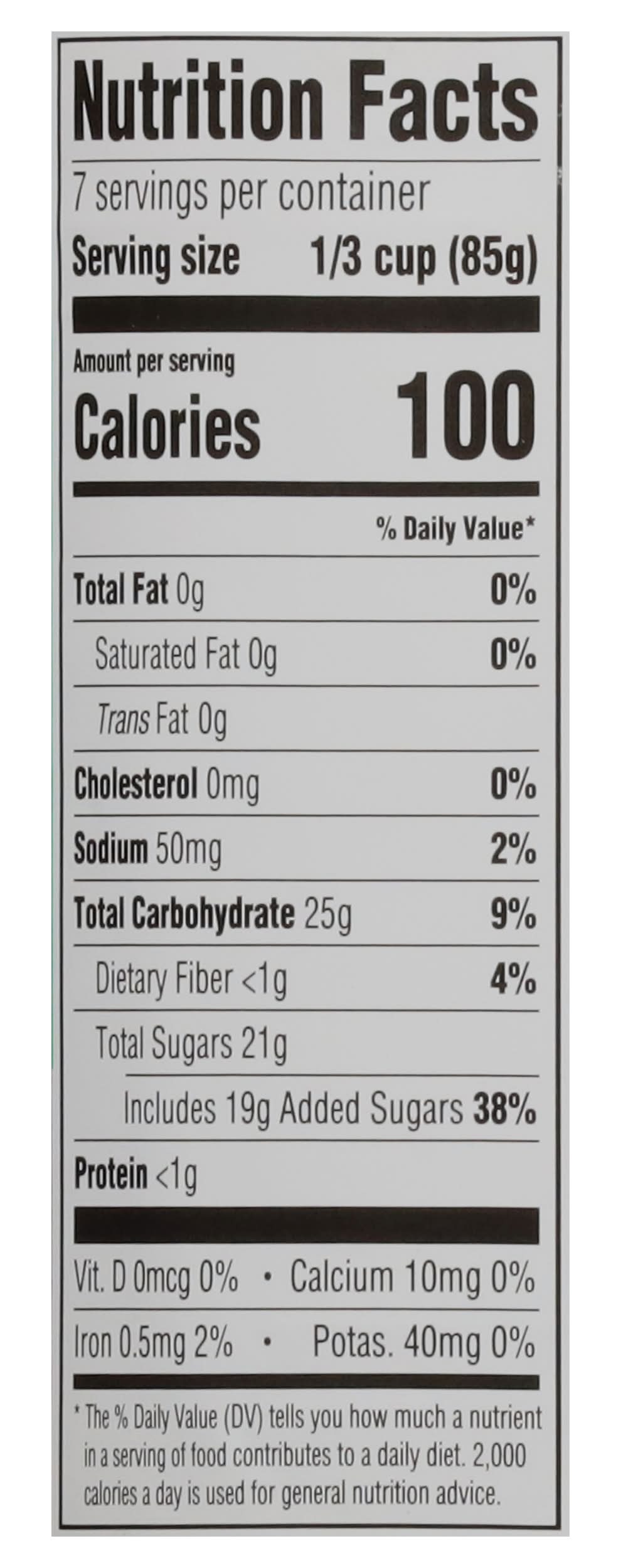 Per 1/3 Cup: 100 calories; 0 g sat fat (0% DV); 50 mg sodium (2% DV); 19 g added sugars (38% DV). No high fructose corn syrup or artificial colors.