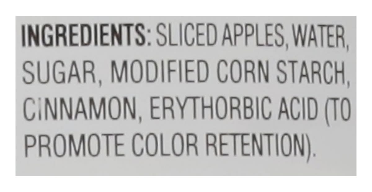Ingredients: Sliced Apples, Water, Sugar, Modified Corn Starch, Cinnamon, Erythorbic Acid (to Promote Color Retention) Contains: Corn