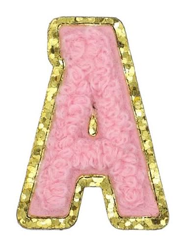 The pink chenille letter with a glittery gold outline can be combined with other patches to personalize tote bags, hats, t-shirts and more.