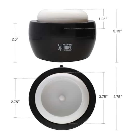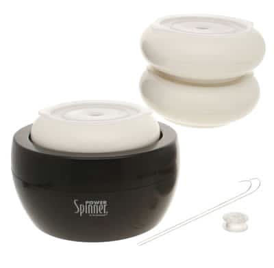 Quickly load small beads onto thread or wire to make custom accessories quickly and effortlessly. Black. 4.75" x 2.5" (21.1cm x 6.4cm) base size. 3.75" x 1.25" (9.5cm x 3.2cm) bowl size. Spins in both directions. Includes 2 spinning wheel needles, thread and 3 interchangeable bowls with lids. Requires 2 AA batteries (not included). The Beadsmith Basic Elements Automatic Bead Spinner