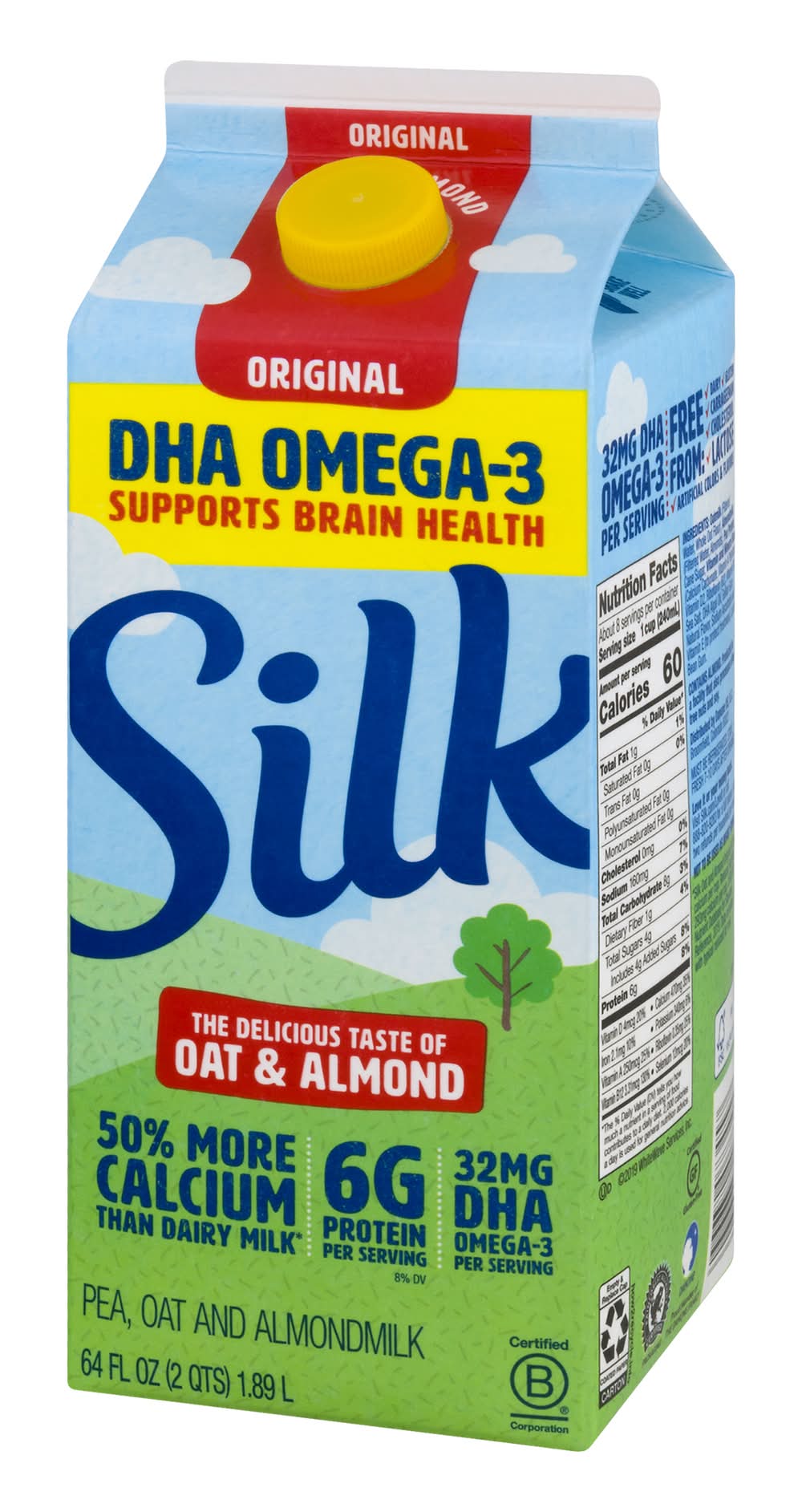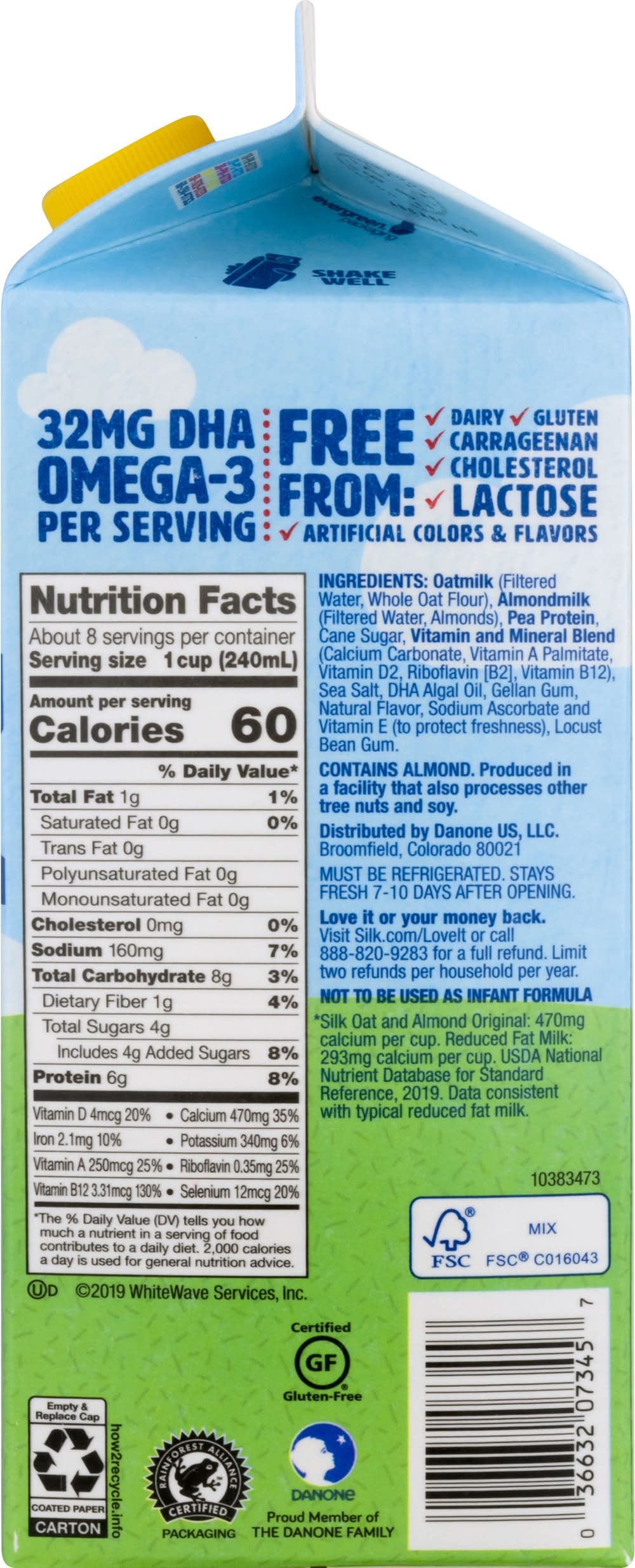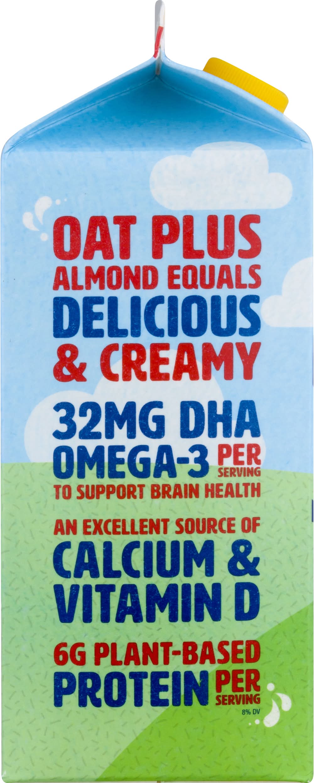 Oatmilk (Filtered Water, Whole Oat Flour), Almondmilk (Filtered Water, Almonds), Pea Protein, Cane Sugar, Vitamin and Mineral Blend (Calcium Carbonate, Vitamin A Palmitate, Vitamin D2, Riboflavin [B2], Vitamin B12), Sea Salt, DHA Algal Oil, Gellan Gum, Natural Flavor, Sodium Ascorbate and Vitamin E (to Protect Freshness), Locust Bean Gum. Contains: Tree Nuts, Gluten, Milk, Lactose, Soybeans