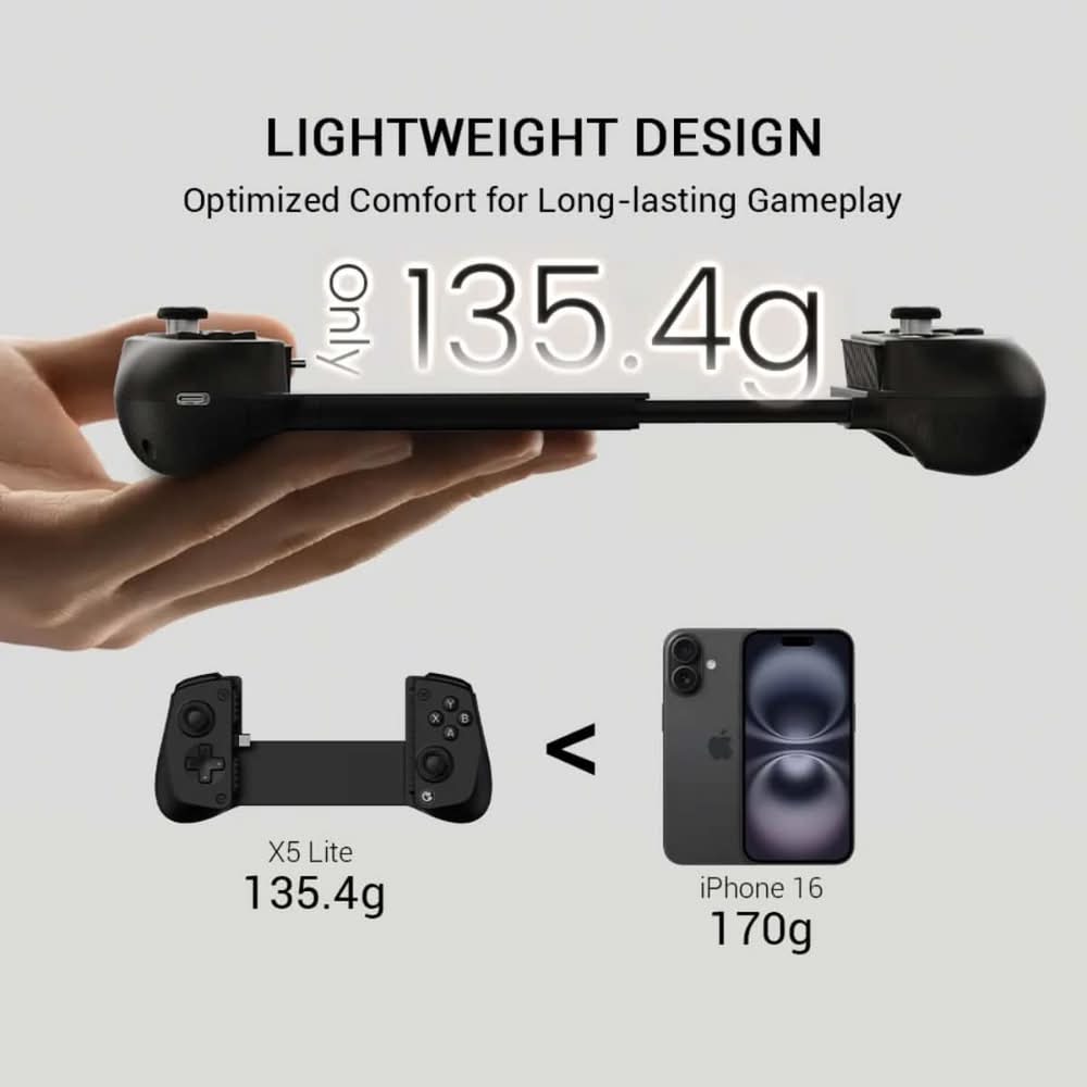 The GameSir X5 Lite is the ideal entry-level mobile controller, offering seamlessconnectivity and wide compatibility. With precise Hall Effect sticks, cushionedtriggers, and Turbo function, it enhances your gaming experience. lts lightweightdesign ensures comfort during long gaming sessions. Plus, pass-through charging andsoftware support ensure uninterrupted play and personalization for all your favoritetitles. Color: Black