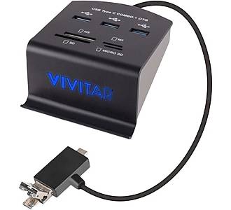 Retrieve files from external storage with this Vivitar USB card reader. Store, transfer and share files with this USB card reader. USB-C and USB 2.0 connectivity offer easy plug-and-play installation, and the compact design fits easily on almost any desk. The four slots support a variety of SD and microSD cards, let you read up to four cards simultaneously and make it easy to transfer files from one card to another. This Vivitar USB card reader connects easily to various computers, smartphones and tablets. - Multimedia card reader supports popular flash card formats - Dimensions: 1.9H x 5.1W x 7.5D - Connects through USB Type-C, USB 2.0, and OTG - Able to read four memory cards simultaneously, exchange and transfer data from one memory card to another - Features four memory card slots: SD/HC, microSD, MS, and M2 (up to 128GB) - Easy plug-and-play installation - Designed to be placed efficiently on any desktop - 1-year manufacturer limited warranty