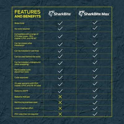 SharkBite Max push-to-connect fittings allow you make pipe connections with half the insertion effort while withstanding double the burst pressure. Featuring a newly designed stainless-steel retainer, SharkBite Max delivers additional strength and durability while providing a 400 PSI press WARNING: This product can expose you to chemicals including lead, which is known to the State of California tocause cancer and birth defects or other reproductive harm. For more information, go to www.P65Warnings.ca.gov. Size: 0.75X0.75 in