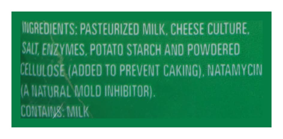 Pasteurized Milk, Cheese Culture, Salt, Enzymes, Potato Starch and Powdered Cellulose (Added to Prevent Caking), Natamycin (a Natural Mold Inhibitor) Contains: Milk Additives: None