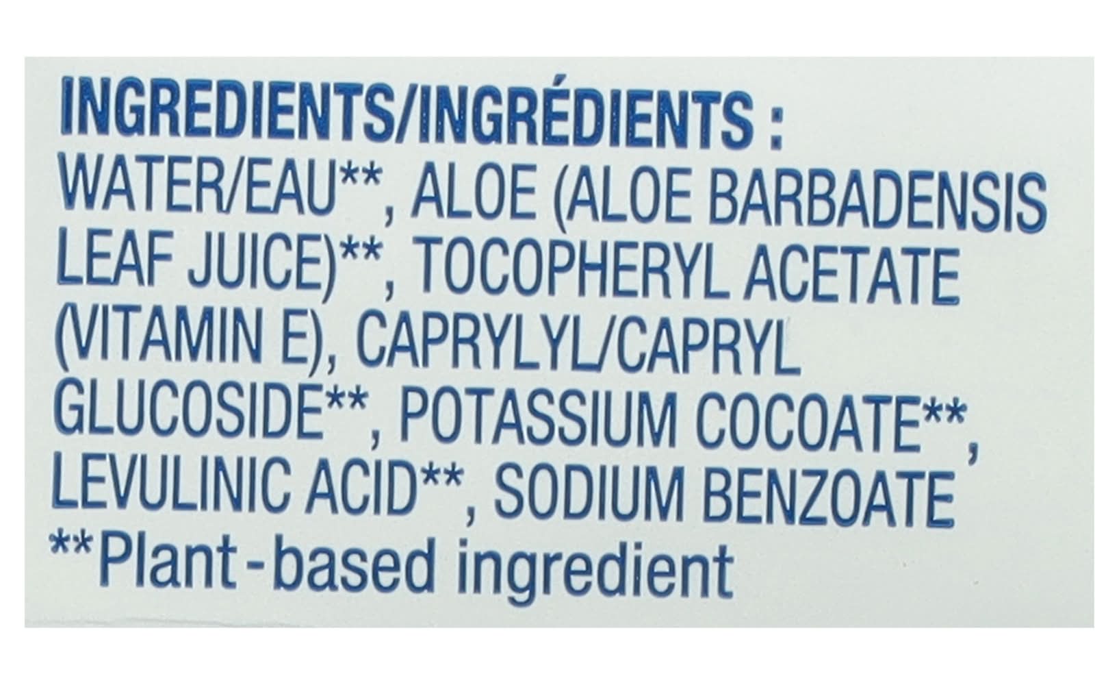 Ingredients: Water/Eau (Plant-Based Ingredient), Aloe (Aloe Barbadensis Leaf Juice) (Plant-Based Ingredient), Tocopheryl Acetate (Vitamin E), Caprylyl/Capryl Glucoside (Plant-Based Ingredient), Potassium Cocoate (Plant-Based Ingredient), Levulinic Acid (Plant-Based Ingredient), Sodium Benzoate