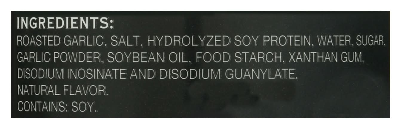 Ingredients: Roasted Garlic, Salt, Hydrolyzed Soy Protein, Water, Sugar, Garlic Powder, Soybean Oil, Food Starch, Xanthan Gum, Disodium Inosinate and Disodium Guanylate, Natural Flavor Contains: Soybeans