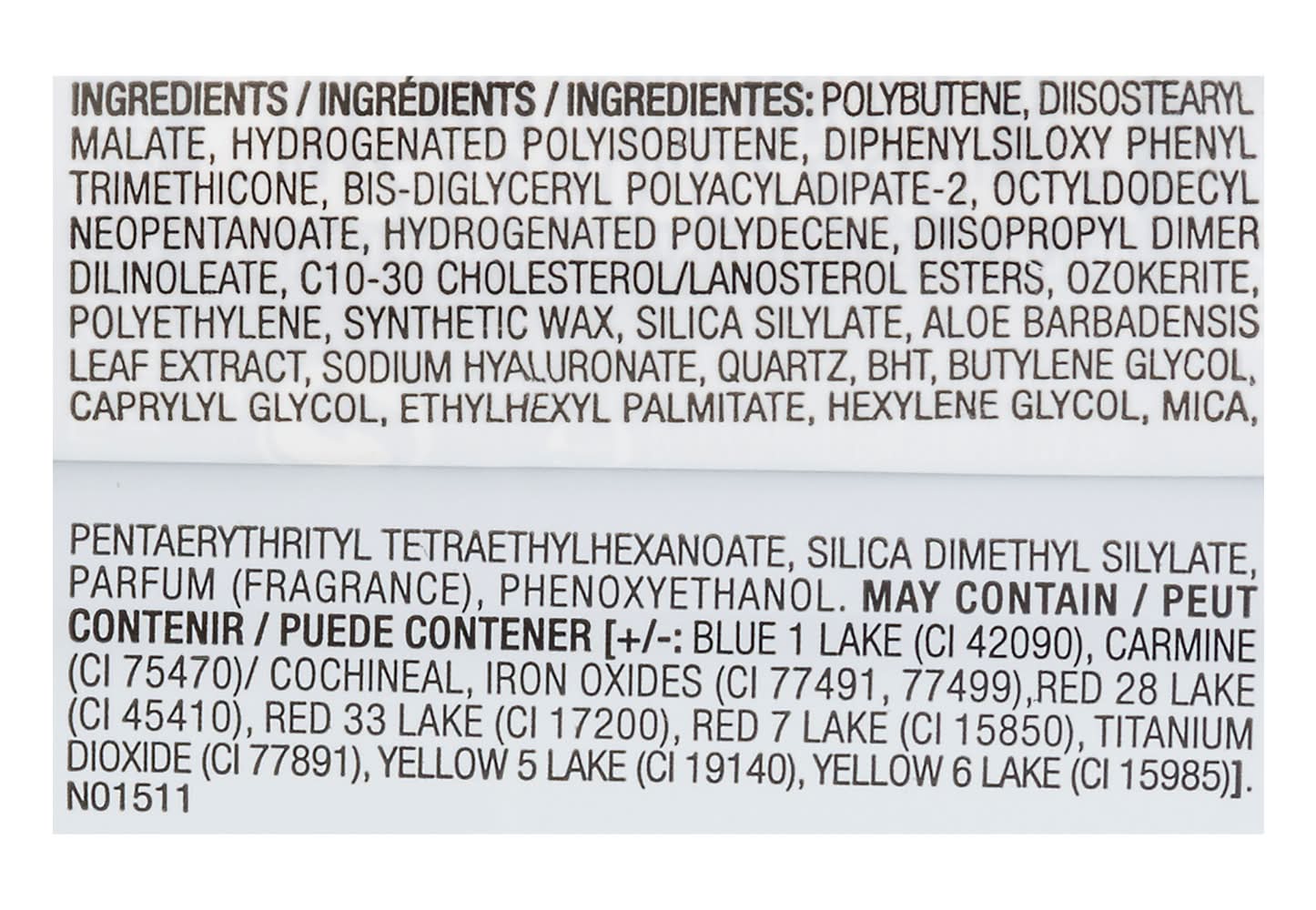 Polybutene, Diisostearyl Malate, Hydrogenated Polyisobutene, Diphenyl Siloxy Phenyl Trimethicone, Bis-Diglyceryl Polyacyladipate-2, Octyldodecyl Neopentanoate, Hydrogenated Polydecene, Diisopropyl Dimer Dilinoleate, C10-30 Cholesterol/Lanosterol Esters, Ozokerite, Polyethylene, Synthtic Wax, Silica Silylate, Aloe Barbadensis Leaf Extract, Sodium Hyaluronate, Quartz, BHT, Butylene Glycol, Caprylyl Glycol, Ethylhexyl Palmitate, Hexylene Glycol, Mica, Pentaerythrityl Tetraethylhexanoate, Silica Dimethyl Silylate, Parfum (Fragrance), Phenoxyethanol. May Contain [+/-: Blue 1 Lake (CI 42090), Carmine (CI 75470)/Cochineal, Iron Oxides (CI 77491, 77499) Red 28 Lake (CI 45410), Red 33 Lake (CI 17200), Red 7 Lake (CI 15850), Titanium Dioxide (CI 77891), Yellow 5 Lake (CI 19140), Yellow 6 Lake (CI 15985)] Contains: None Additives: None