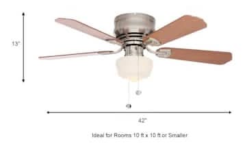 This 42 in. Middleton ceiling fan is an ideal accessory for a small room up to 10 ft. x 10 ft. This ceiling fan features a light kit for convenient lighting and provides an airflow rate of up to 2785 CFM. The fan offers understated styling with its brushed nickel finish and white globe shade. It has 5 blades are reversible so you can customize the look to complement your decor.