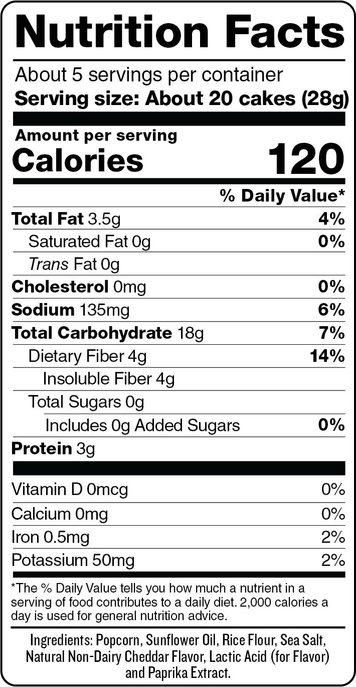 Popcorn, Sunflower Oil, Rice Flour, Sea Salt, Natural Non-Dairy Cheddar Flavor, Lactic Acid for Flavor and Paprika Extract. Contains: None Additives: None