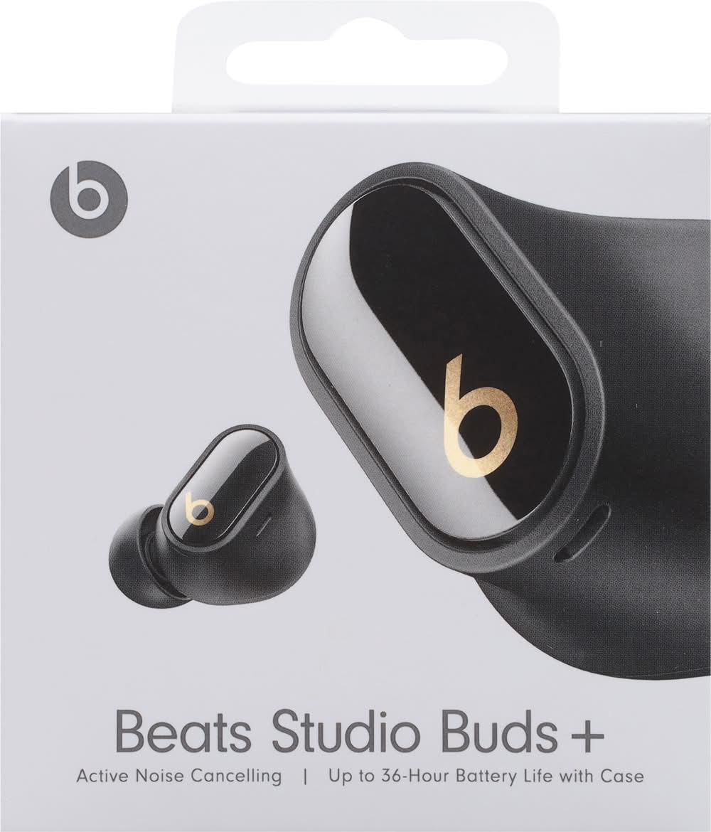 New Beats Studio Buds + In the Box: • Beats Studio Buds + • Pocketable charging case • Eartips with four size options • USB-C to USB-C charging cable • Warranty card Powerful Sound. Perfect Fit. Beats Studio Buds + feature powerful, balanced sound, Active Noise Cancelling (ANC), Transparency mode, high-quality calls, enhanced Apple & Android compatibility, up to 36 hours of battery life¹ and 4 ear tip options to ensure a comfortable all-day fit. Sound Quality | Powerful, Balanced Sound Beats’ custom acoustic platform delivers rich, immersive sound whether you’re listening to music or taking calls. Each bud is equipped with a custom two-layer transducer that flexes to deliver cleaner bass and ultralow distortion. Three acoustic vents improve audio precision and gently relieve pressure for a more comfortable all-day fit. Listening Modes | Active Noise Cancelling At the touch of a button, two dynamic listening modes let you choose whether to keep the world out or let it in. Active Noise Cancelling adapts to your personal fit, neutralizing unwanted external noise. With 3x larger microphones, new venting, and a powerful processor, Beats Studio Buds + has up to 1.6x more active noise cancelling power and up to 2x improved Transparency.² Transparency Mode Transparency mode blends your listening experience with the world around you. External-facing microphones capture ambient sound to mix in with your music when you need to be aware of your surroundings. Spatial Audio | Surrounds You in Sound Beats Studio Buds + support spatial audio for immersive music — delivering a surround sound experience — that you can take anywhere. ³ It’s like being surrounded by 64 speakers at once. Fit | All-Day Comfort With four ear tip options (XS, S, M & L) to fit a wider range of ears, Beats Studio Buds + create a comfortable acoustic seal for the best listening experience, securing your earbuds in place. Battery Life | More Music, Less Charging With up to 36 hours of total battery life⁴ from the sleek, pocket-sized charging case, Beats Studio Buds + are ready to go whenever you are. Call Quality | Crystal Clear Calls 3x larger microphones⁵, powerful ANC, and a voice-targeting algorithm precisely filter background noise for crisp, clear call performance. On-Device Controls | At Your Fingertip Simple, customizable on-ear controls allow you to manage music, toggle listening modes, take calls and activate voice assistant using the ‘b’ button. Enhanced Apple & Android Compatibility | Easy to Use & Hard to Lose Beats Studio Buds + offer a robust set of native Apple and Android features including: one-touch pairing, automatic switching, ‘always on’ voice assistance, and ‘Find My.’ ⁶ ¹ Testing conducted by Apple in March 2023 using preproduction Beats Studio Buds + and Charging Case units and software paired with iPhone 13/iPhone 14 units and prerelease software. The playlist consisted of 358 unique audio tracks purchased from the iTunes Store (256-Kbps AAC encoding). Volume was set to 50% and Active Noise Cancellation and Transparency were turned off. Testing consisted of full Beats Studio Buds + battery discharge while playing audio until the first Beats Studio Buds + stopped playback. Battery life depends on device settings, environment, usage, and many other factors. ² As compared to Beats Studio Buds (1st generation). ³ Compatible hardware and software required. Works with compatible content in supported apps. Not all content available in Dolby Atmos. ⁴ Testing conducted by Apple in March 2023 using preproduction Beats Studio Buds + and Charging Case units and software paired with iPhone 13/iPhone 14 units and prerelease software. The playlist consisted of 358 unique audio tracks purchased from the iTunes Store (256-Kbps AAC encoding). Volume was set to 50% and Active Noise Cancellation and Transparency were turned off. Testing consisted of full Beats Studio Buds + battery discharge while playing audio until the first Beats Studio Buds + stopped playback. Battery life depends on device settings, environment, usage, and many other factors. ⁵ As compared to Beats Studio Buds (1st generation). ⁶ Requires an iCloud account and a compatible Apple device running the latest operating system software or a compatible Android device running Android 8.0 or later, with Google Play Services enabled. Color: Black