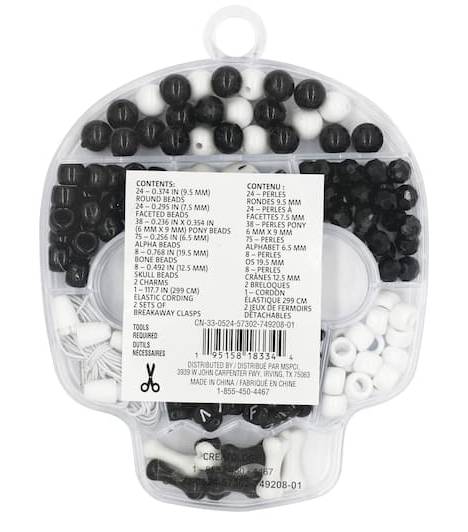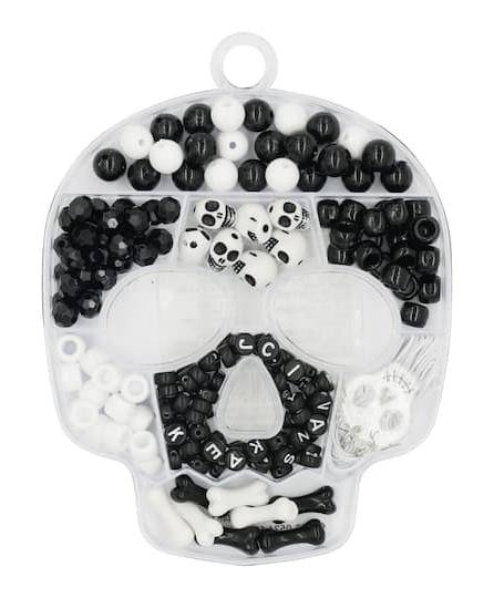 Its assortment of beads, unique charms, cording and clasps is perfect for crafting necklaces and stretch bracelets with friends, and comes packaged in a skull-shaped box with dividers to keep their projects tidy and organized. Black and white. 4.8" x 6.2" x 0.8" (12.19cm x 15.75cm x 2.03cm) box size. Includes box with dividers. Requires scissors (sold separately). For ages 4 and up. 75 alpha beads (0.256"/6.5 mm each)38 pony beads (0.236" x 0.354"/6mm x 9mm each)