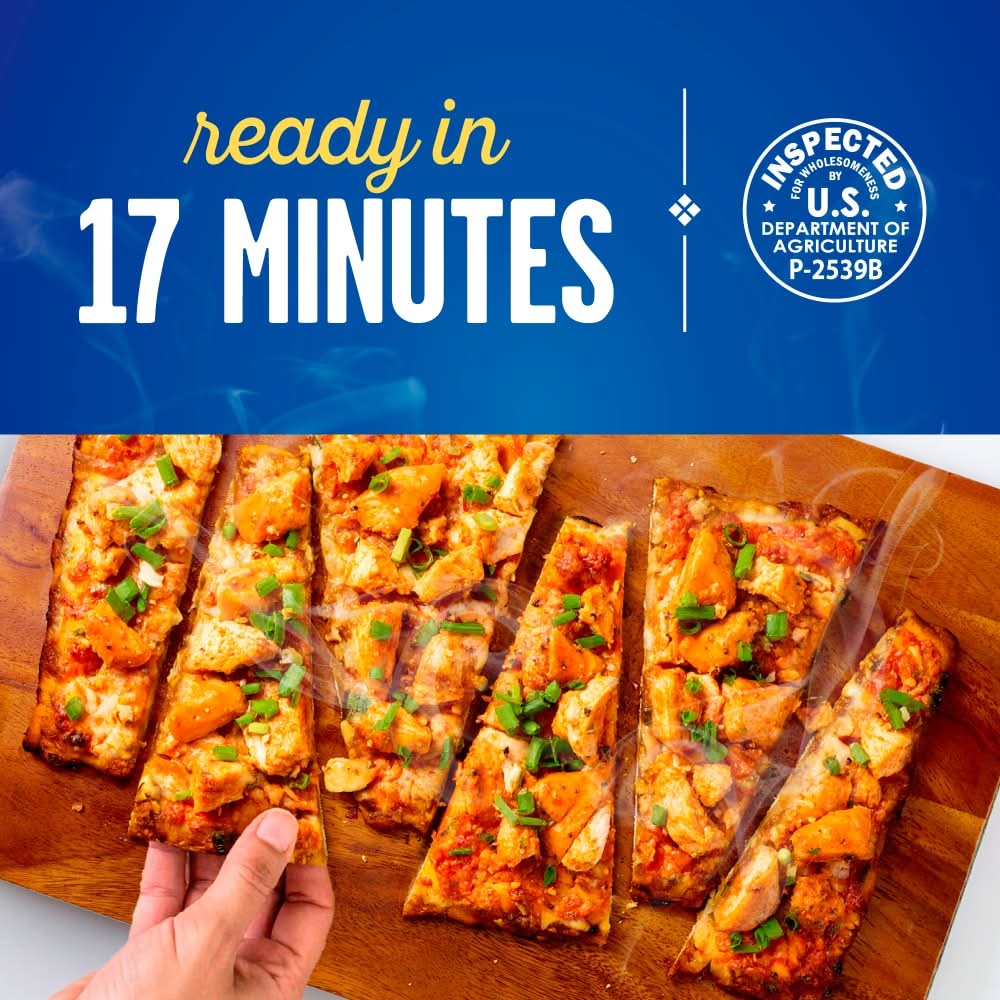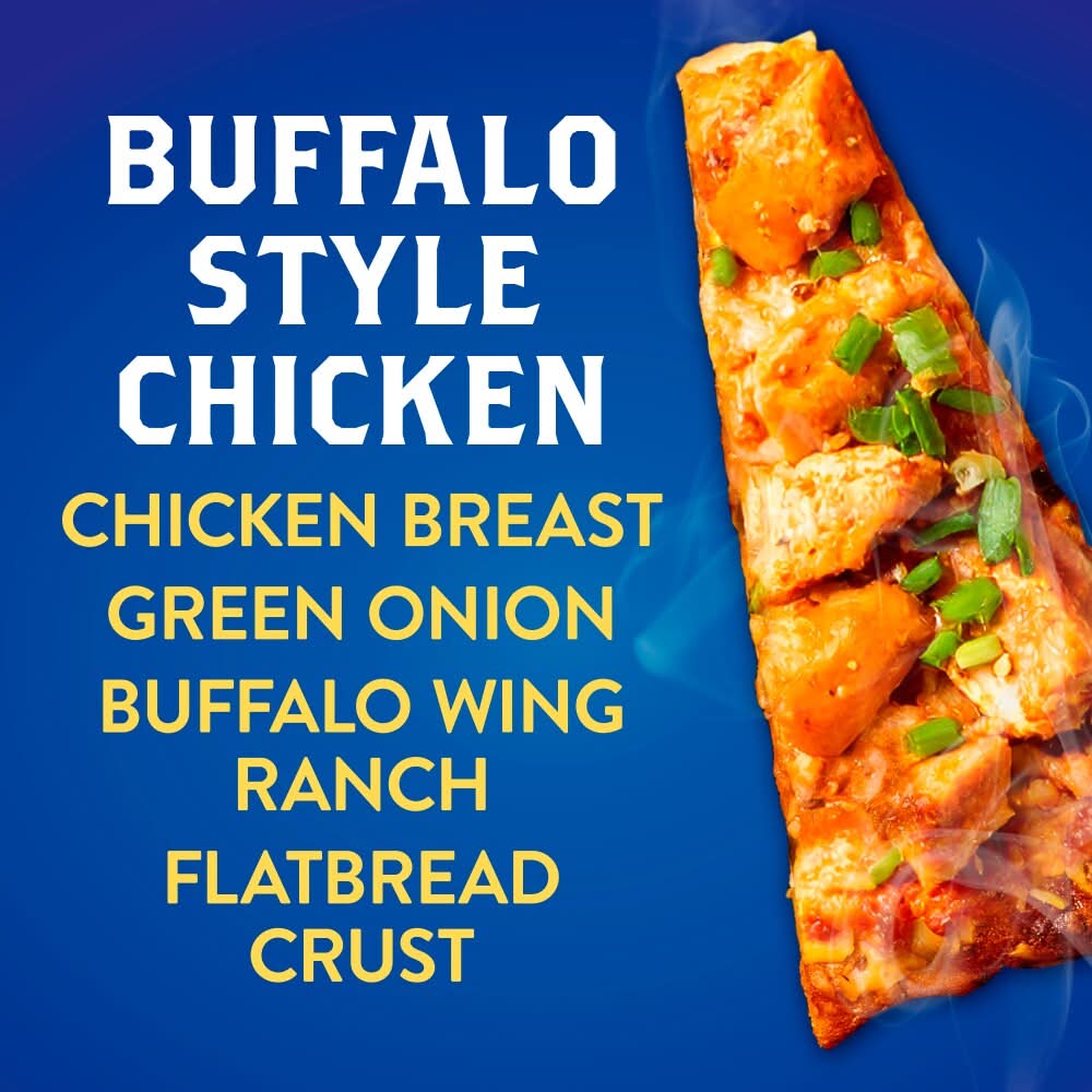 It is a tasty combo of tangy, savory, and cheesy! This flatbread is topped with diced chicken breast and green onion, with a creamy buffalo wing and ranch sauce blend for a bold bite. This flatbread is ready in 17 minutes for a crispy bite that's perfect for lunch, dinner, or even a delicious snack. • Flavor: Buffalo style chicken • Size: 12.7 oz