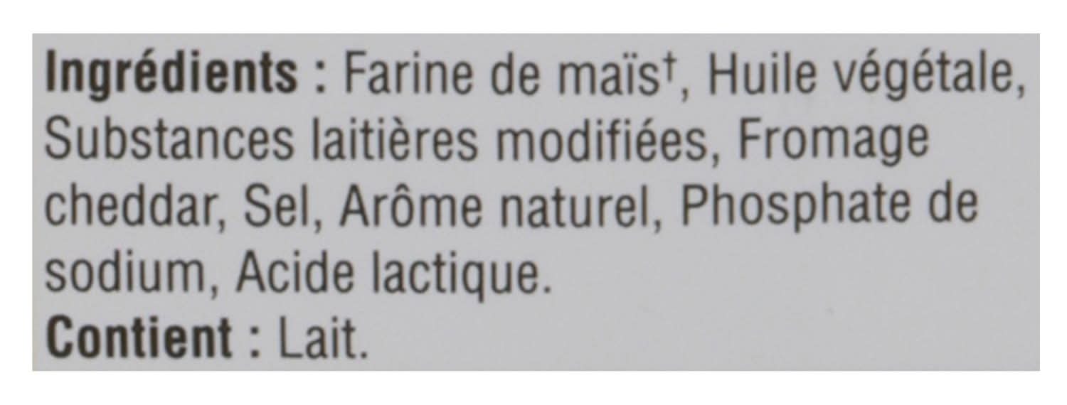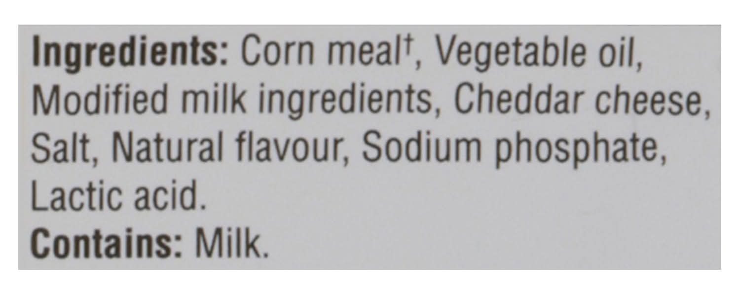 Corn meal†, vegetable oil, modified milk ingredients, cheddar cheese, salt, natural flavour, sodium phosphate, lactic acid. CONTAINS: milk. † Non-GMO Contains: Milk