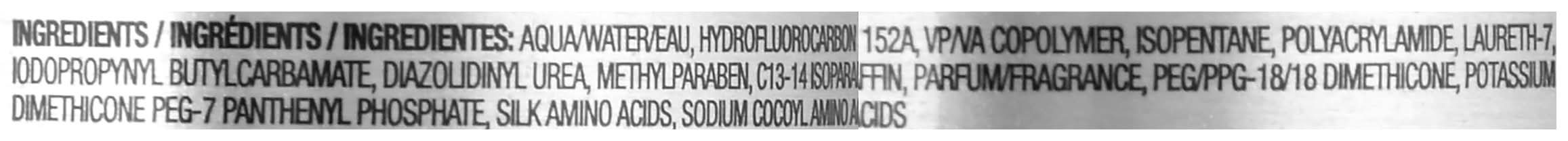 Aqua Water/Eau, Hydroflucarbon 152A, VP/VA Copolymer, Isopentane, Polyacarylamide, Laureth-7, Iodopropynyl Butylcarbamate, Diazolidinyl Urea, Methylparaben, C13-14 Isoparaffin, Parfum/Fragrance, PEG/PPG-18/18 Dimethicone, Potassium Dimethicone PEG-7 Panthenyl Phosphate, Silk Amino Acids, Sodium Cocoyl Amino Acids