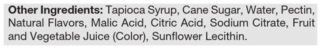 Ingredients: Cane Sugar, Water, Pectin, Natural Flavors, Malic Acid, Citric Acid, Sodium Citrate, Fruit and Vegetable Juice (Color), Sunflower Lecithin, Tapioca Syrup