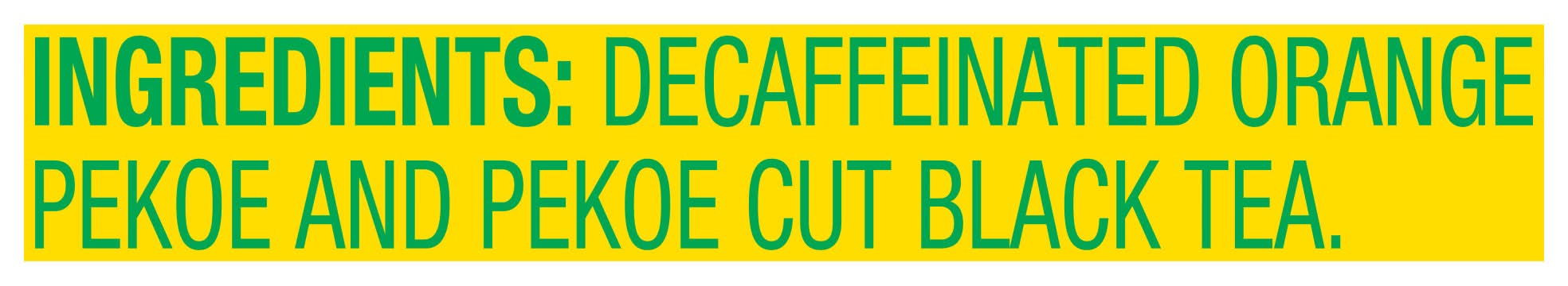 Ingredients: Decaffeinated Orange Pekoe and Pekoe Cut Black Tea Rainforest Alliance Certified Black Tea.
