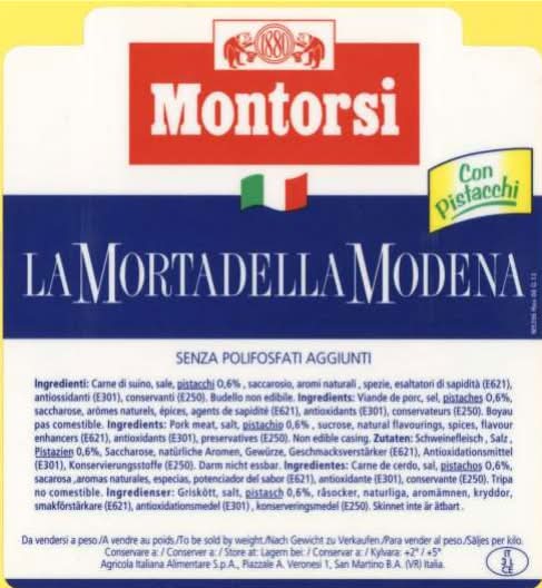 Dans le respect de la tradition de la viande de porc froide émilienne, Modena n'est préparée qu'avec de la viande de porc de première qualité. Caractérisée par un goût plein et savoureux, elle est exquise aussi bien coupée en tranches fines qu'en dés. Agricola Italiana Alimentare SPA, Piazzale A. Veronesi 1 San Martino B.A. 37036 Italie