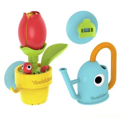 A garden theme bath toy- a flower pot with a worm and a flower that hides a bumble bee inside it. Also includes a watering can. Use the included watering can to make the worm pop up, the flower bloom, and the bee appear – a chain reaction of fun! It's not just a bath toy; it's a learning adventure exploring cause and effect, STEM concepts, and imaginative play. Pour water for a magical garden, engage in pretend tasks, and strengthen muscles. Safe for tubs, sinks, and pools, this battery-free toy runs on the power of water, sparking curiosity and endless fun.