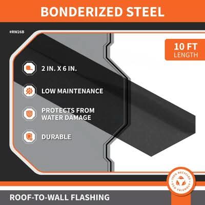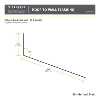 The Gibraltar Roof-To-Wall Flashing is made from trusted 28-Gauge bonderized steel. It is designed to cover and protect roof-to-wall intersections from water infiltration. Bonderized steel is coated with a surface that makes it ready to paint. Roof-To-Wall flashing is bent at a 110°. The shorter vertical plane is attached to the upper floor wall under the building paper, the lower plane sits on top of the underlayment and under the shingles. 2 In. X 6 In. X 10 Ft.