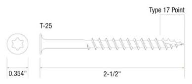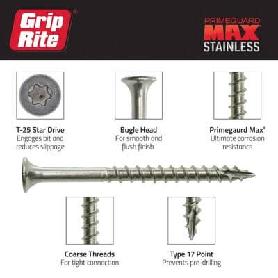 Grip-Rite MAX MAXS21210DS3051 #10 x 2-1/2 in. 305 Stainless Steel Star Drive Bugle Head Coarse Thread Deck Screws feature a T17 point for easy, hassle-free installation. Ideal for use around pools and in coastal areas, a corrosion resistant coating protects these fasteners, prolonging the life of your deck. Improved thread design and nibs under the drive head reduce slippage in your treated wood and wood to wood deck. Cancer and Reproductive Harm- www.P65Warnings.ca.gov Size: 10x2-1/2 in