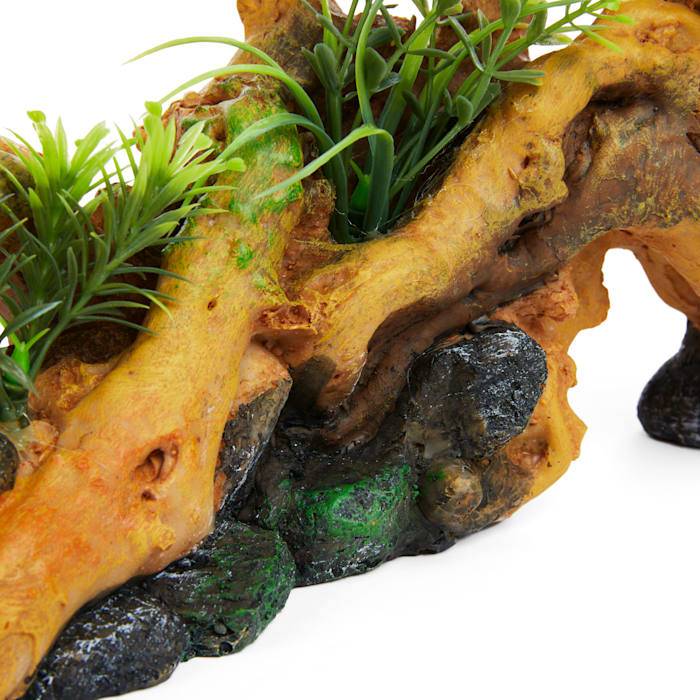 This fun driftwood piece with plants adds color and a natural look to your aquatic environment. This decor is also an ideal hiding spot for your fish when he or she gets stressed and just wants a little quiet time.