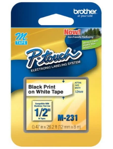 When you're ready to replace the tape in your Brother label maker, Brother M-231 12mm tape is an excellent choice for many tasks. For quality labels that provide clear, sharp information, M-231 tape by Brother delivers. Black on White; 1 Each Nonlaminated, adhesive-backed; for indoor and light use Use with Brother P-touch label printers 12mm (8/17") Width x 26-1/5' Length Create labels for home, home office, school or hobbies Compatible with Brother P-Touch PT-100, PT-110, PT-70, PT-80 and PT-85 models. Brother M-231 black-on-white tape allows you to create bold, easy-to-read labels. For quality labeling of your files, folders, accessories and more. Nonlaminated tapes are ideal for indoor/light use. Choose Brother tape (M-231) for a wide array of needs. Conveniently extend the life of your labeler. Color: White