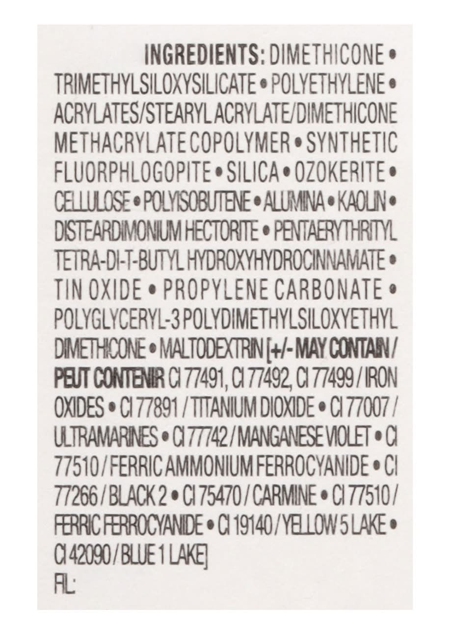 Ingredients: Dimethicone, Trimethylsiloxysilicate, Polyethylene, Acrylates/Stearyl Acrylate/Dimethicone Methacrylate Copolymer, Synthetic Fluorphlogopite, Silica, Ozokerite, Cellulose, Polyisobutene, Alumina, Kaolin, Disteardimonium Hectorite, Pentaerythrityl Tetra-Di-T-Butyl Hydroxyhydrocinnamate, Tin Oxide, Propylene Carbonate, Polyglyceryl-3 Polydimethylsiloxyethyl Dimethicone, Maltodextrin