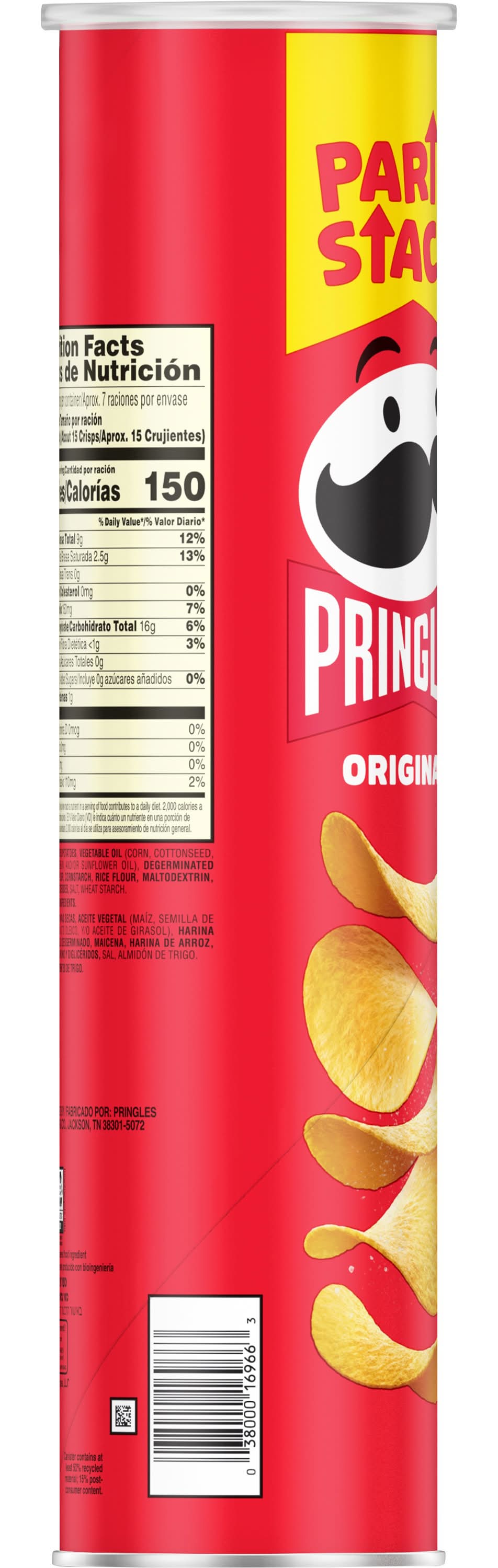 What comes next after the “pop” of a Pringles Original Grab N’ Go can? The crisp, crunchy, hit-the-spot taste of potato seasoned with yummy salt. Ingeniously shaped Pringles Original potato crisps chips are insanely light, crispy, and never greasy. Perfect for sharing, these crisps chips are perfectly salty and bursting with savory flavor. With this convenient, portable can, it’s easy to create your own snacking moments wherever and whenever; Grab a can as a pick-me-up for after school or pack as the ultimate car snack for road trips. Bring these snacks to game time and pack a few for other Pringles fans. Stash this anytime snack in your work desk or pantry to enjoy anytime. Share Pringles at your next cookout or BBQ to turn up the flavor and fun among family and friends. Get your hands on Pringles Original potato crisps chips for an irresistible taste experience that keeps you coming back, stack after stack. • Flavor: Original • Size: 1 CT • Pringles manufacturing co., Jackson, TN, 38301-5072 • Packaging: Reusable