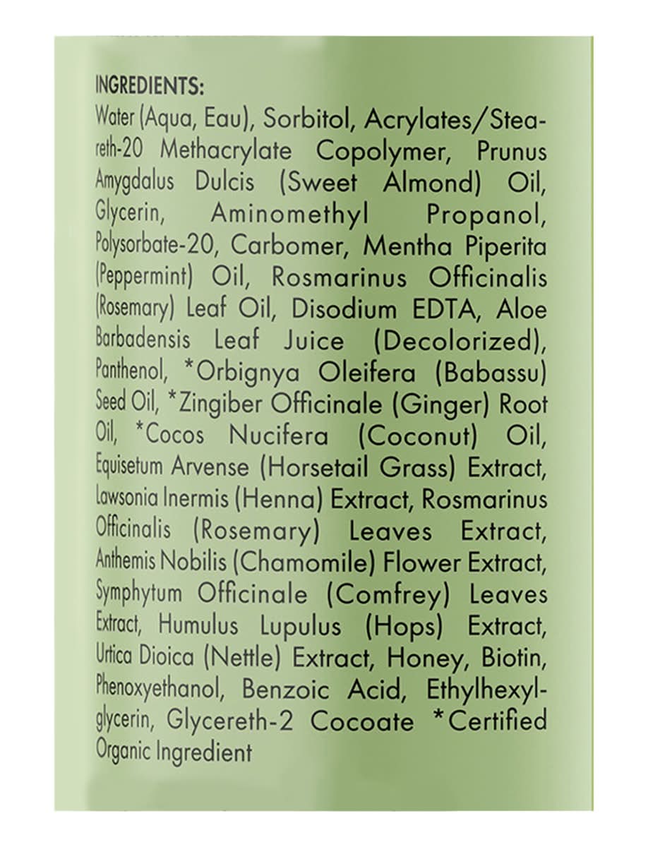 Ingredients: Water (Aqua, Eau), Sorbitol, Acrylates/Steareth-20 Methacrylate Copolymer, Prunus Amygdalus Dulcis (Sweet Almond) Oil, Glycerin, Aminomethyl Propanol, Polysorbate-20, Carbomer, Mentha Piperita (Peppermint) Oil, Rosmarinus Officinalis (Rosemary) Leaf Oil, Disodium EDTA, Aloe Barbadensis Leaf Juice (Decolorized), Panthenol, *Orbignya Oleifera (Babassu) Seed Oil, *Zingiber Officinale (Ginger) Root Oil, *Cocos Nucifera (Coconut) Oil, Equisetum Arvense (Horsetail Grass) Extract, Lawsonia Inermis (Henna) Extract, Rosmarinus Officinalis (Rosemary) Leaves Extract, Anthemis Nobilis (Chamomile) Flower Extract, Symphytum Officinale (Comfrey) Leaves Extract, Humulus Lupulus (Hops) Extract, Urtica Dioica (Nettle) Extract, Honey, Biotin, Phenoxyethanol, Benzoic Acid, Ethylhexylglycerin, Glycereth-2 Cocoate. * Certified Organic Ingredient Contains: Tree Nuts, Almonds