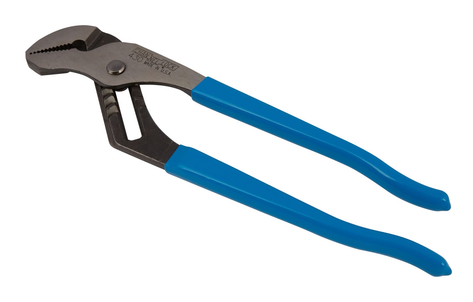 The Channellock 10 in. Straight Jaw Tongue and Groove Pliers are constructed with high-carbon steel and fashioned with laser heat-treated teeth for strong, nonslip jaw action. Undercut tongue-and-groove fabrication allows this heavy-duty tool to perform without slipping, providing maximum torque and leverage aided by the comfort of Channellock BLUE grips. The patented PermaLock fastener eliminates bolt and nut failure in any of the seven adjustable jaw settings, supplying strength to loosen and tighten threaded hardware up to 2 in. Size: 10 In