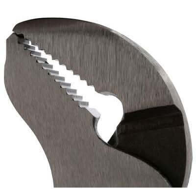 The Channellock 10 in. Straight Jaw Tongue and Groove Pliers are constructed with high-carbon steel and fashioned with laser heat-treated teeth for strong, nonslip jaw action. Undercut tongue-and-groove fabrication allows this heavy-duty tool to perform without slipping, providing maximum torque and leverage aided by the comfort of Channellock BLUE grips. The patented PermaLock fastener eliminates bolt and nut failure in any of the seven adjustable jaw settings, supplying strength to loosen and tighten threaded hardware up to 2 in. Size: 10 In