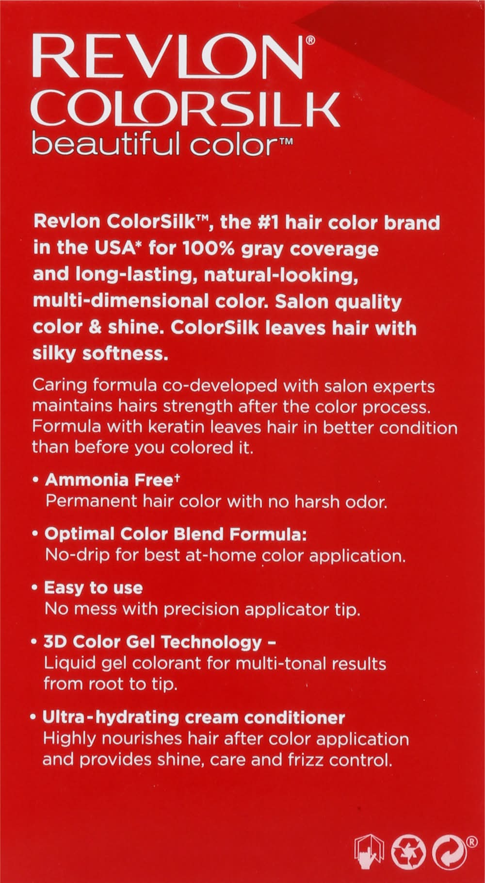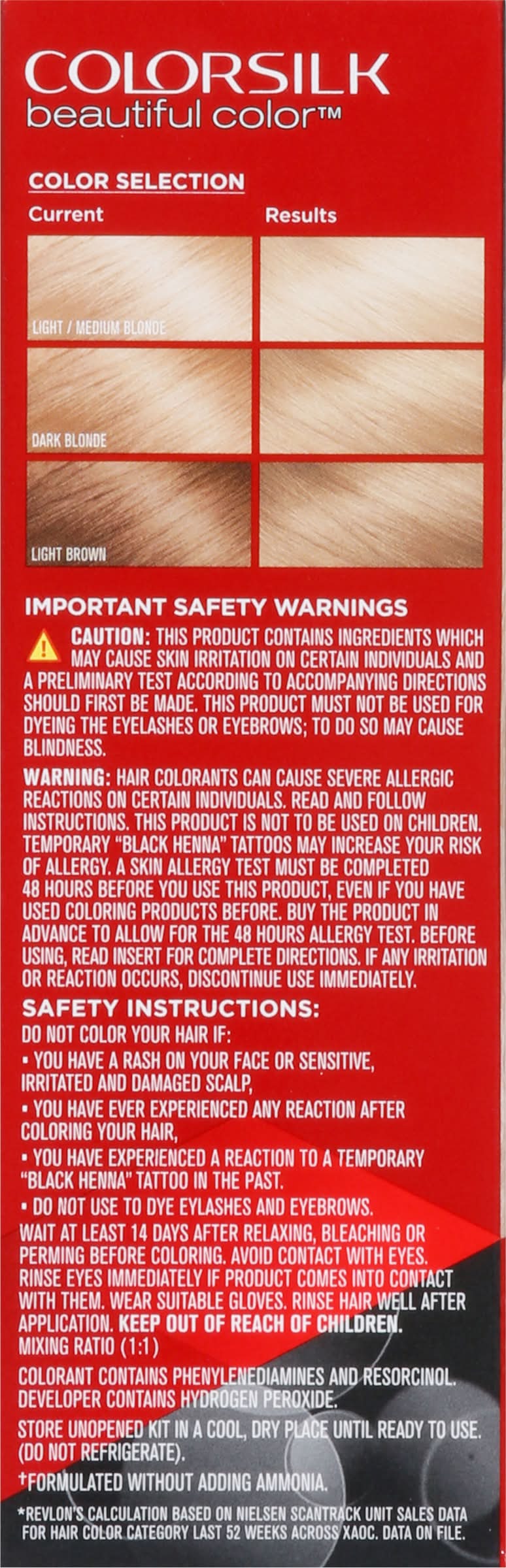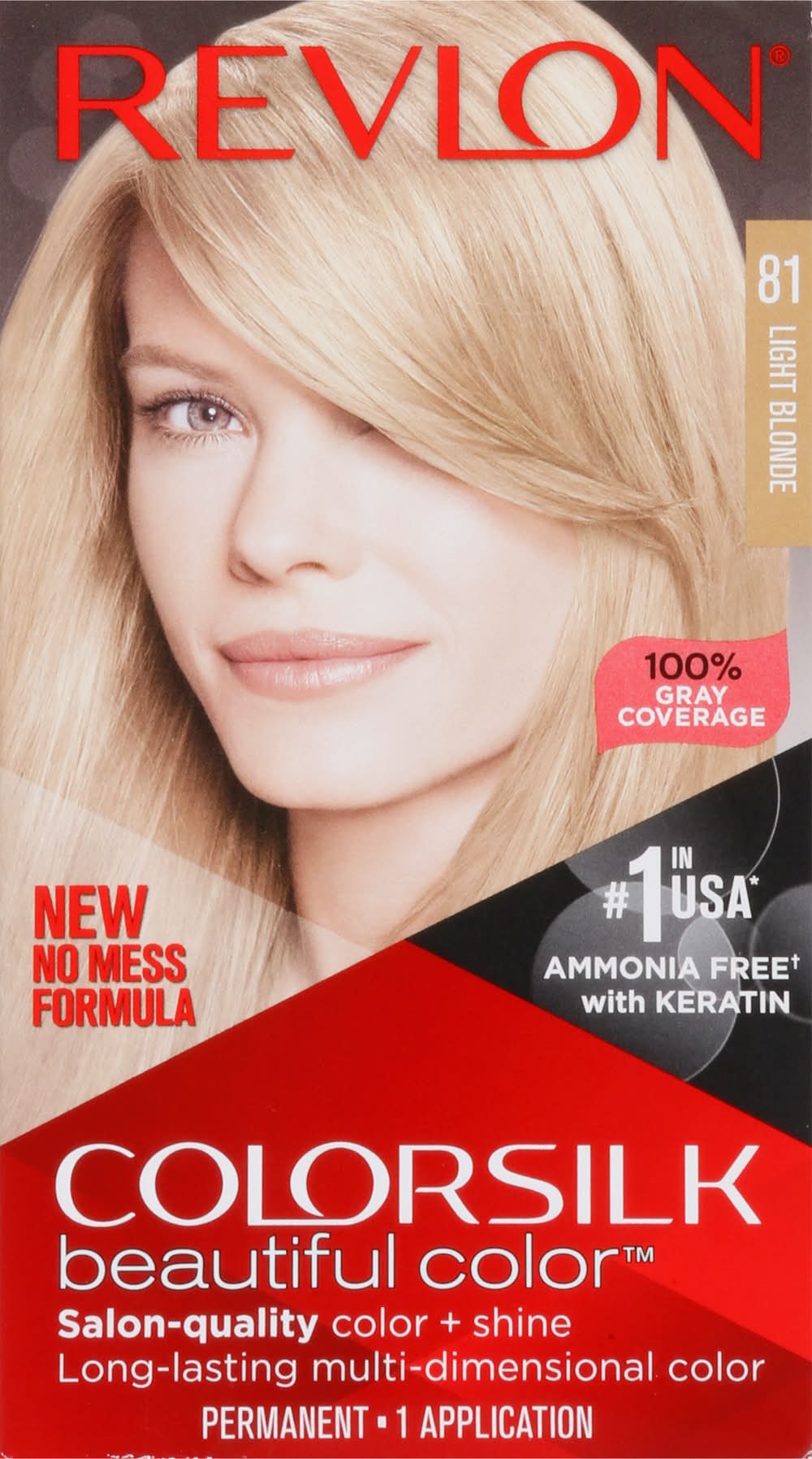 Package Contents: 1 Ammonia free (Formulated without adding ammonia) colorant 2 fl oz. / 59.1 ml. 1 Cream color developer 2 fl oz. / 59.1 ml. 1 After-color conditioner 0.4 fl oz. / 11.8 ml. 1 Application instructions & 1 pair of gloves. 100% gray coverage. New no mess formula. No 1 in USA (Revlon's calculation based on Nielsen Scantrack unit sales data for hair color category last 52 weeks across xaoc. Data on file). Ammonia free (Formulated without adding ammonia) with keratin. Salon-quality color + shine long-lasting multi-dimensional color. Permanent. 1 application. Revlon ColorSilk, the No 1 hair color brand in the USA (Revlon's calculation based on Nielsen Scantrack unit sales data for hair color category last 52 weeks across xaoc. Data on file) for 100% gray coverage and long-lasting, natural-looking, multi-dimensional color. Salon quality color & shine. ColorSilk leaves hair with silky softness. Caring formula co-developed with salon experts maintains hairs strength after the color process. Formula with keratin leaves hair in better condition than before you colored it. Ammonia free (Formulated without adding ammonia) permanent hair color with no harsh odor. Optimal color blend formula: No-drip for best at-home color application. Easy to use. No mess with precision applicator tip. 3D color gel technology. Liquid gel colorant for multi-tonal results from root to tip. Ultra hydrating cream conditioner. Highly nourishes hair after color application and provides shine, care and frizz control. Spanish speaking hair color experts also available. Made in USA. with US and Non-US components. • Color: 81 light blonde • Packaging: Reusable