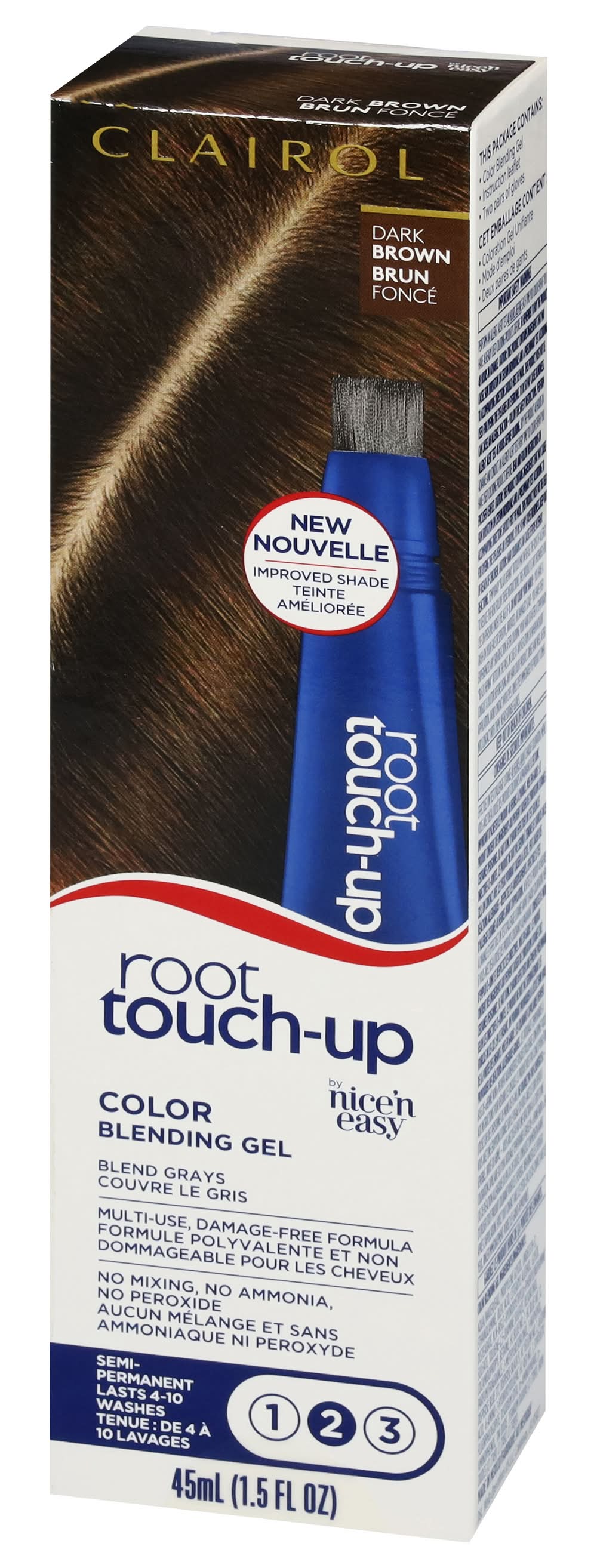 This package contains: Color blending gel; Instruction leaflet; Two pairs of gloves. Dark brown. New. Improved shade. By nicen easy. Mends greys. Multi-use, damage-free formula. No mixing, no ammonia, no peroxide. Semi-permanent lasts 4-10 washes. Touch up in 10-20 min. Blended color gradually fades with washing. Before. Blended result. Perfect for: touching up your temples and trouble spots. 30% - 50% Gray hair. Not for stubborn greys. precision brush for targeted application. Multi-use, no mixing, no mess, no damage. www.Clairol.com. Questions? Call the expert color consultants at 1-800-Clairol (1-800-252-4765), visit our website at www.Clairol.com, or search for Clairol on Facebook Messenger to chat with us! Looking for 100% gray coverage? Try Root Touch-Up Permanent Cream. Made in Mexico. Coty Inc., New York, NY, 10118