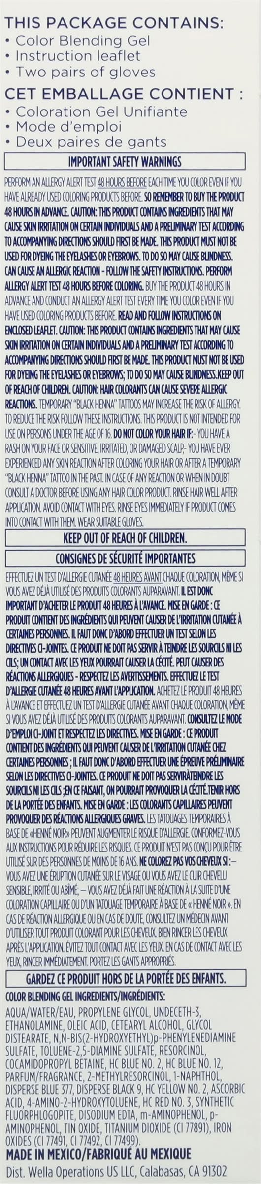 Color Blending Gel Ingredients: Aqua/Water/Eau, Propylene Glycol, Undeceth-3, Ethanolamine, Oleic Acid, Cetearyl Alcohol, Glycol Distearate, N-Bis(2-Hydroxyethyl)P-Phenylenediamine Sulfate, Toluene-2.5-Diamine Sulfate, Resorcinol, Cocamidopropyl Betaine, Hc Blue 2, Hc Blue 12, Parfum/Fragrance, 2-Methylresorcinol, 1-Naphthol, Disperse Blue 377, Disperse Black 9, Hc Yellow 2, Ascorbic Acid, 4-Amino-2-Hydroxytoluene, Hc Red 3, Synthetic Fluorphlogopite, Disodium EDTA, M-Aminophenol, Paminophenol, Tin Oxide, Titanium Dioxide (CI 77891), Iron Oxides (CI 77491 CI 77492 CI 77499)